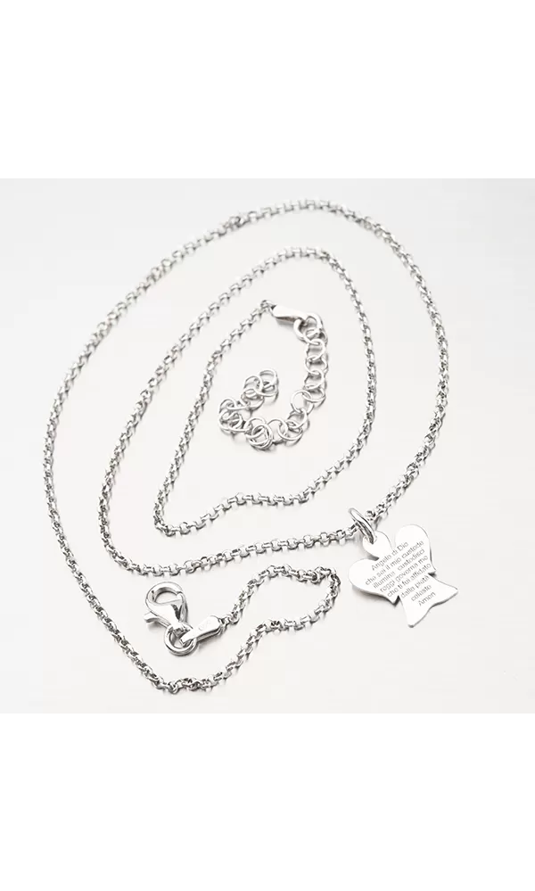 Symbolický náhrdelník s přívěskem anděla, který je z jedné strany zdobený textem "Andělíčku, můj strážníčku" s tím, že text je uveden italsky.… Celý popis