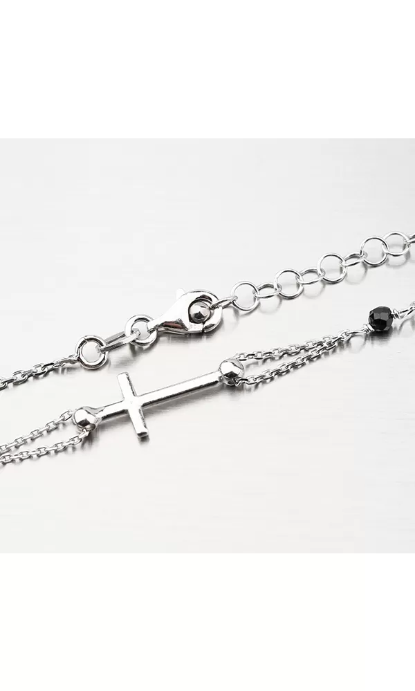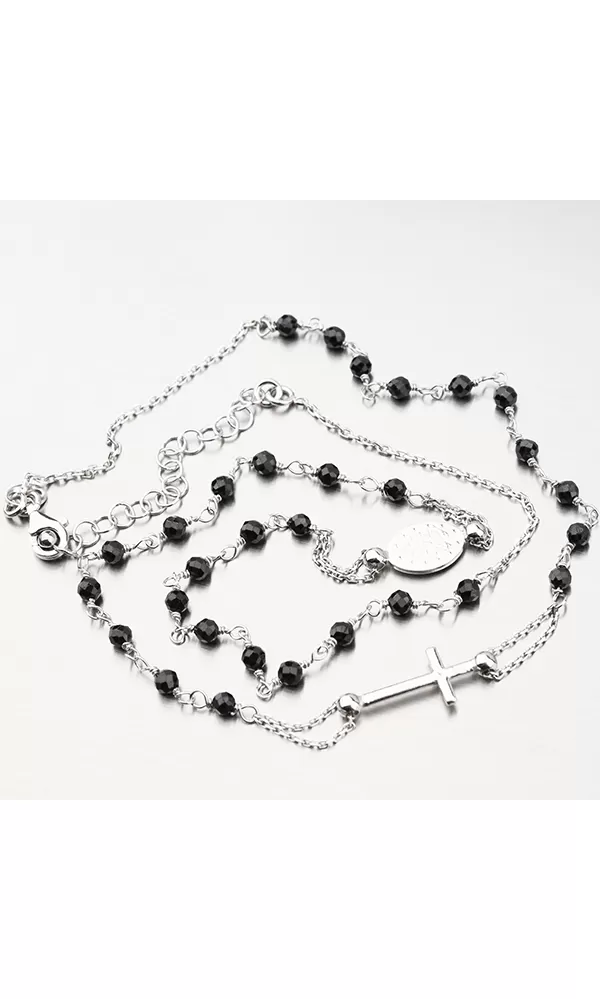 Symbolický náhrdelník dekorovaný černými krystaly a poté s přívěskem s vyobrazenou postavou Madonky a s přívěskem křížku. Délka náhrdelníku je 46 cm, s využitím řetízku 4 cm, je možné náhrdelník zapnout v délce 46 až 50 cm. Nastavitelná délka má úžasnou výhodu v tom, že nemusíte znát přesnou délku řetízku a darovaná osoba si délku sama upraví podle vlastních preferencí.