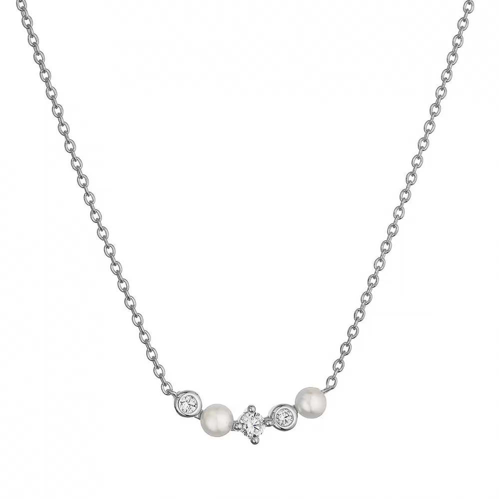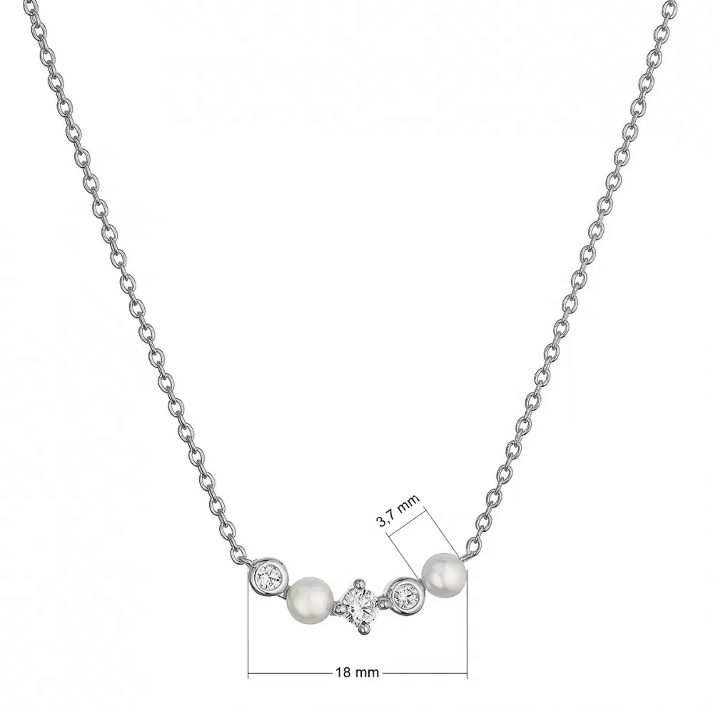 Náhrdelník vyniká svým tvarem, který je tvořen drobnou linií prvků. Uprostřed je dominantní čirý zirkon, který dodává šperku na eleganci. Říční perly v přírodním bílém odstínu se střídají s menšími zirkony, což vytváří harmonický a vyvážený vzhled. Ideální pro každodenní nošení i slavnostní příležitosti.