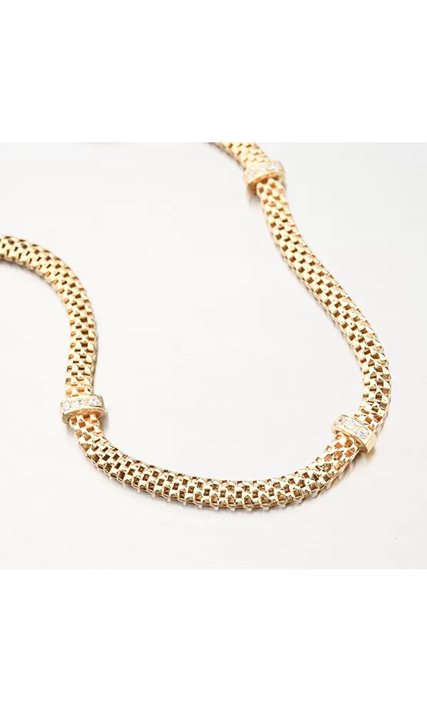 Proplétaný náhrdelník zdobený drobnými dílky, které jsou osazeny zářivými zirkony v briliantovém brusu. Žlutou barvu zlata dodává technika zlacení PVD. Předností zlacení technologií PVD je vysoká tvrdost a odolnost proti otěru! Jedná se o silnou vrstvu, která proniká do původního materiálu. Zlacení technologií PVD se dá srovnat s přibližně 12 mikrony galvanického zlacení, což je vysoká hodnota, která při běžném nošení vydrží až 12 let.