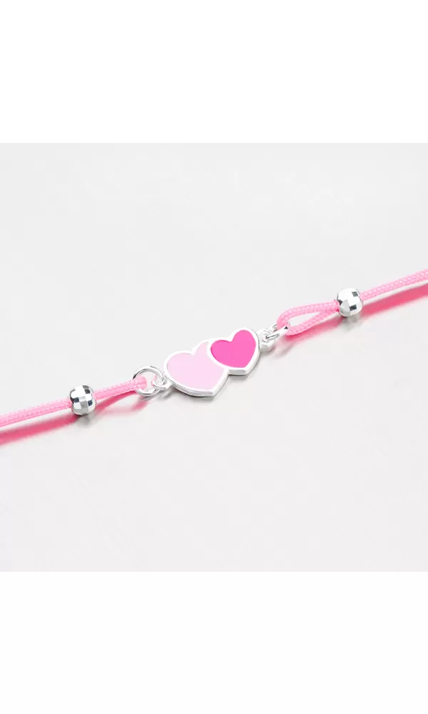 I holčičky se chtějí líbit a ozdobit se. Dopřejme jim to a překvapte je dárkem. Tento náramek je pro ně jako stvořený. Je vyroben ze stříbra 925/1000 v kombinaci s textilem v růžové barvě. Náramek zdobí přívěsek ze stříbra ve tvaru srdíček, které jsou dozdobeny růžovým smaltem.