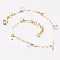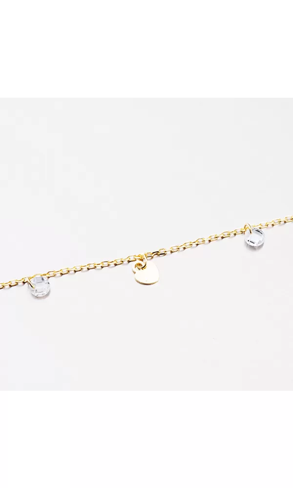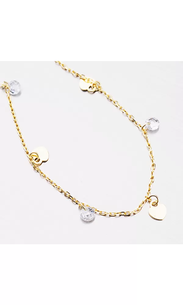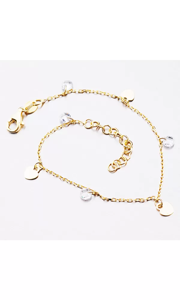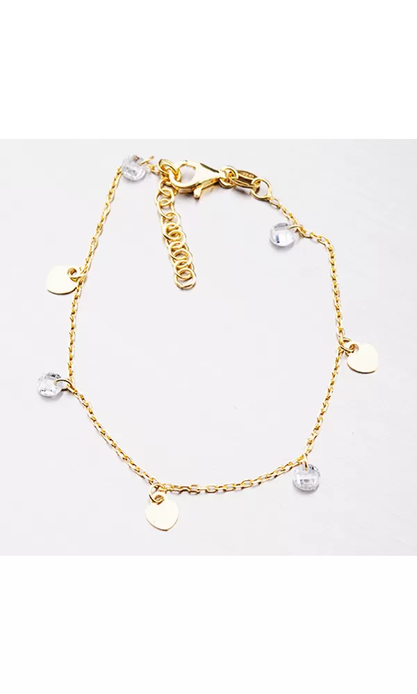 Stříbrný náramek v jemném designu je zdobený přívěsky a zirkony. Zirkony jsou precizně broušené tak, aby každým vaším pohybem hrály zářivou hru se světlem. Náramek je zlacený techniou PVD v žluté barvě zlata. Předností zlacení technologií PVD je vysoká tvrdost a odolnost proti otěru! Jedná se o silnou vrstvu, která proniká do původního materiálu. Zlacení technologií PVD se dá srovnat s přibližně 12 mikrony galvanického zlacení, což je vysoká hodnota, která při běžném nošení vydrží až 12 let.