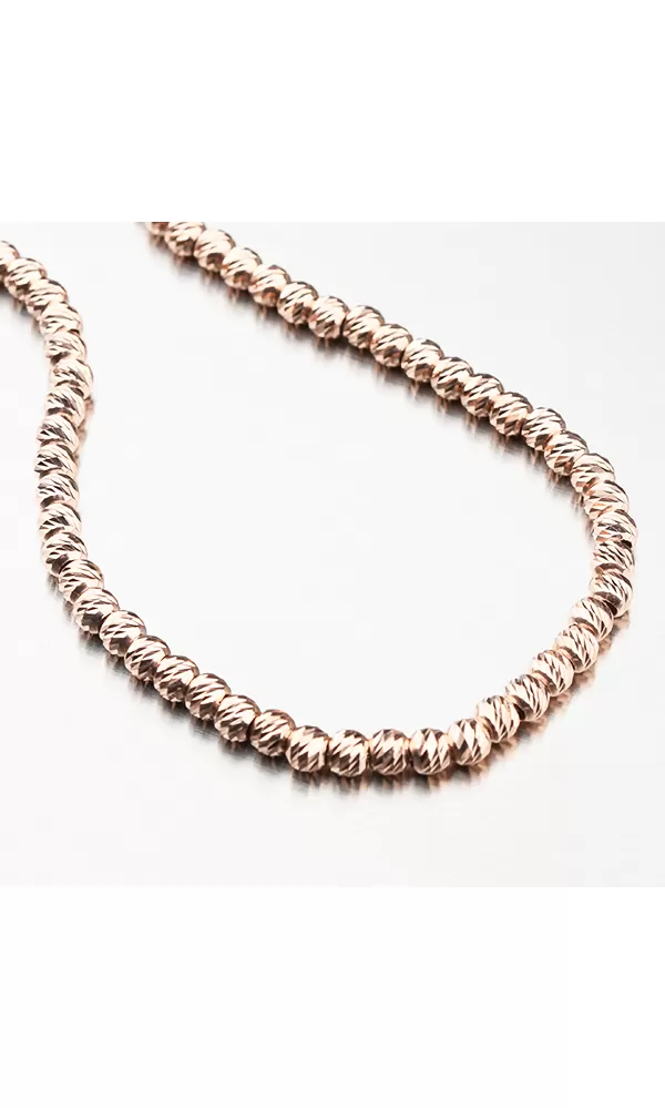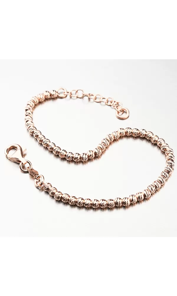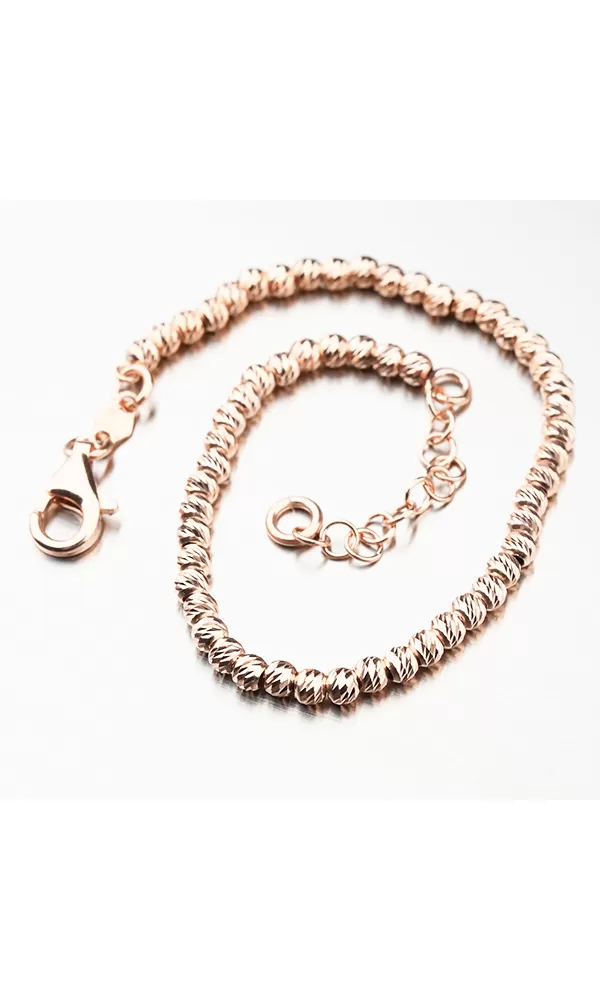 Velmi pohodlný dámský náramek je tvořen ze stříbrných kuliček. Náramek je zlacen technikou PVD v barvě růžového zlata. Předností zlacení technologií PVD je vysoká tvrdost a odolnost proti otěru! Jedná se o silnou vrstvu, která proniká do původního materiálu. Zlacení technologií PVD se dá srovnat s přibližně 12 mikrony galvanického zlacení, což je vysoká hodnota, která při běžném nošení vydrží až 12 let. Každá z kuliček je precizně gravírovaná. Facety jsou zhotoveny diamantovým nástrojem, který dodává vzniklým facetám maximální lesk, díky kterému dokonale odráží světlo a mají krásnou brilanci ze všech úhlů pohledu!