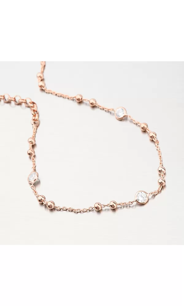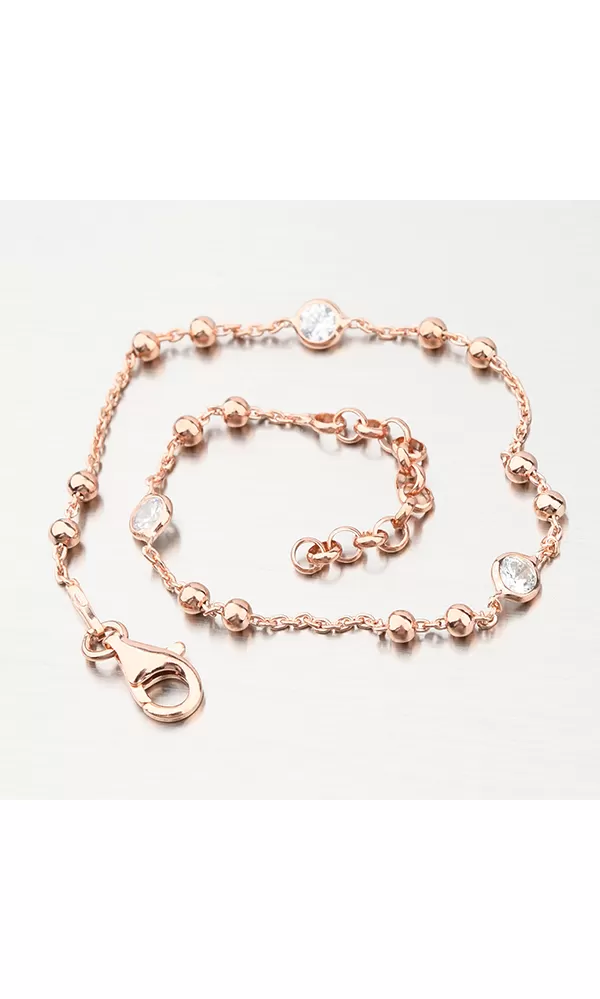 Jemný náramek typu Anker dekorovaný drobnými kuličkami a zářivými zirkony. Růžovou barvu zlata náramku dodává technika zlacení PVD. Předností zlacení technologií PVD je vysoká tvrdost a odolnost proti otěru! Jedná se o silnou vrstvu, která proniká do původního materiálu. Zlacení technologií PVD se dá srovnat s přibližně 12 mikrony galvanického zlacení, což je vysoká hodnota, která při běžném nošení vydrží až několik let.