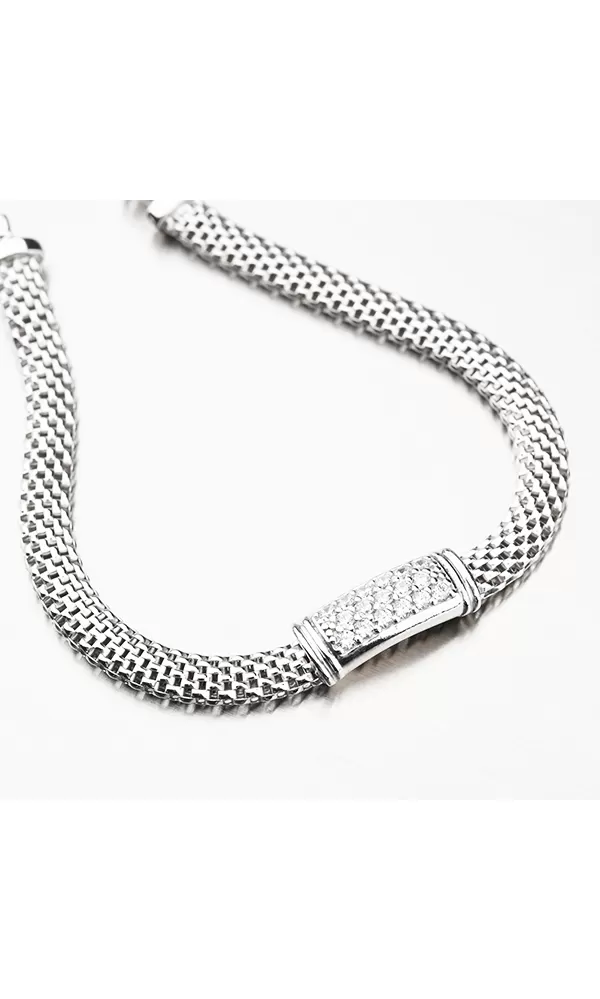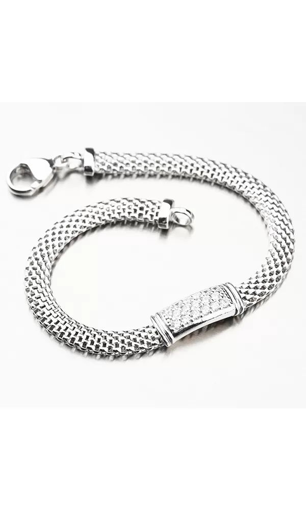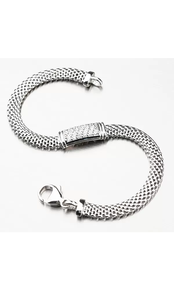 Náramek je v elegantním designu zdobený obdélníkem osázeným zirkony v briliantovém brusu. Stříbrný náramek se zapíná na karabinu.