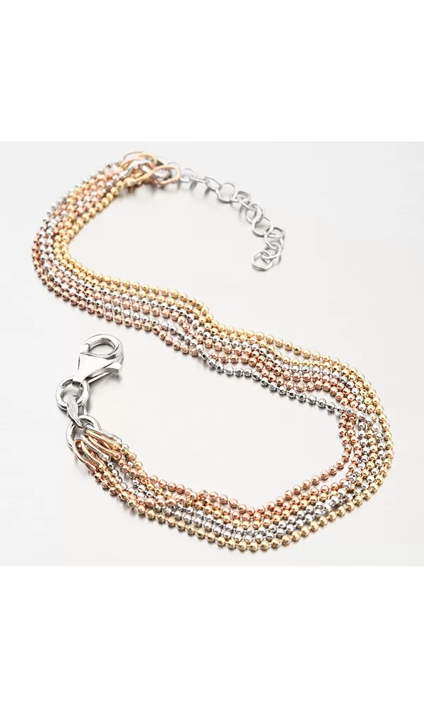 Luxusní náramek v provedení se třpytivými drobnými kuličkami, které jsou zdobené facetami. Facety jsou lesklé plošky dělané za pomocí nástroje s diamantovým hrotem. Facety díky své vlastnosti odrážet světlo, dodávají celému šperku maximální lesk a brilanci ze všech úhlů. Žlutou a růžovou barvu zlata mu dodává technika zlacení PVD. Předností zlacení technologií PVD je vysoká tvrdost a odolnost proti otěru! Jedná se o silnou vrstvu, která proniká do původního materiálu. Zlacení technologií PVD se dá srovnat s přibližně 12 mikrony galvanického zlacení, což je vysoká hodnota, která při běžném nošení vydrží až 12 let.