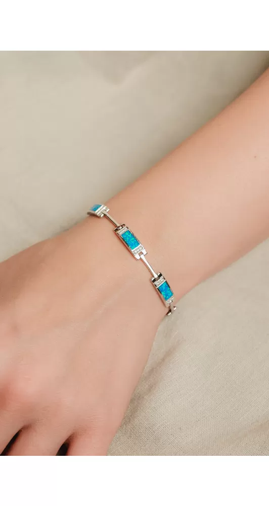 Chystáte se koupit náramek, který podtrhne vaši krásu? Tento náramek bude bezkonkurenční ozdobou pro všechny ženy. Náramek je lemován ozdobami hranatého tvaru, které zdobí syntetický modrý opál a poté na stranách bílé zirkony briliantového brusu. Šperky s opály zaujmou okolí na první pohled. Modrý opál je proslulý svými zářivými odlesky a krásnou barvou, která dokonale vyladí Váš outfit. Briliantový brus zirkonů zajišťuje maximální brilanci vybroušených facet, dokonale odráží světlo a neuvěřitelně září z každého úhlu pohledu.