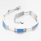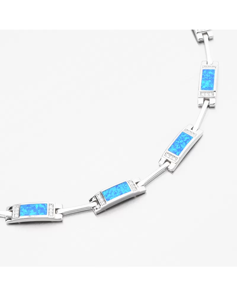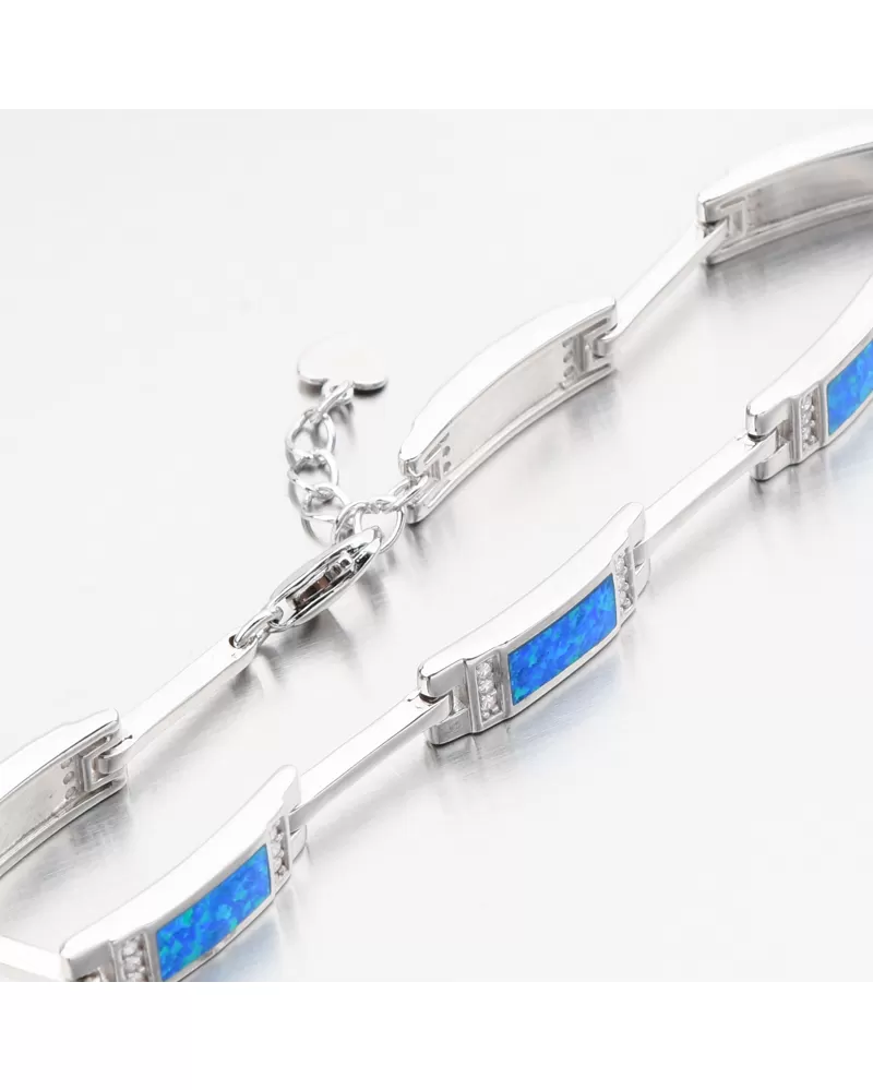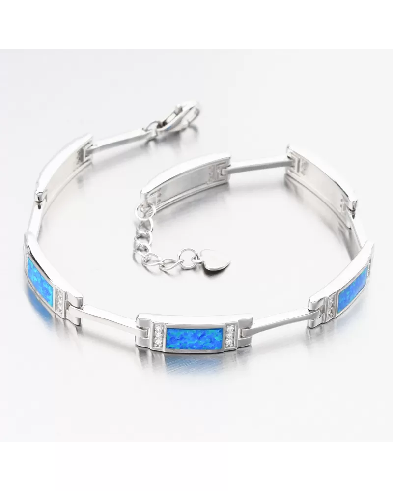 Chystáte se koupit náramek, který podtrhne vaši krásu? Tento náramek bude bezkonkurenční ozdobou pro všechny ženy. Náramek je lemován ozdobami hranatého tvaru, které zdobí syntetický modrý opál a poté na stranách bílé zirkony briliantového brusu. Šperky s opály zaujmou okolí na první pohled. Modrý opál je proslulý svými zářivými odlesky a krásnou barvou, která dokonale vyladí Váš outfit. Briliantový brus zirkonů zajišťuje maximální brilanci vybroušených facet, dokonale odráží světlo a neuvěřitelně září z každého úhlu pohledu.