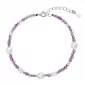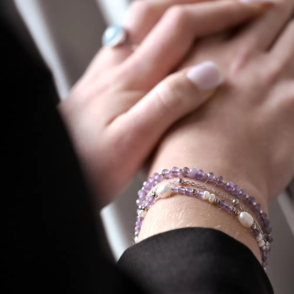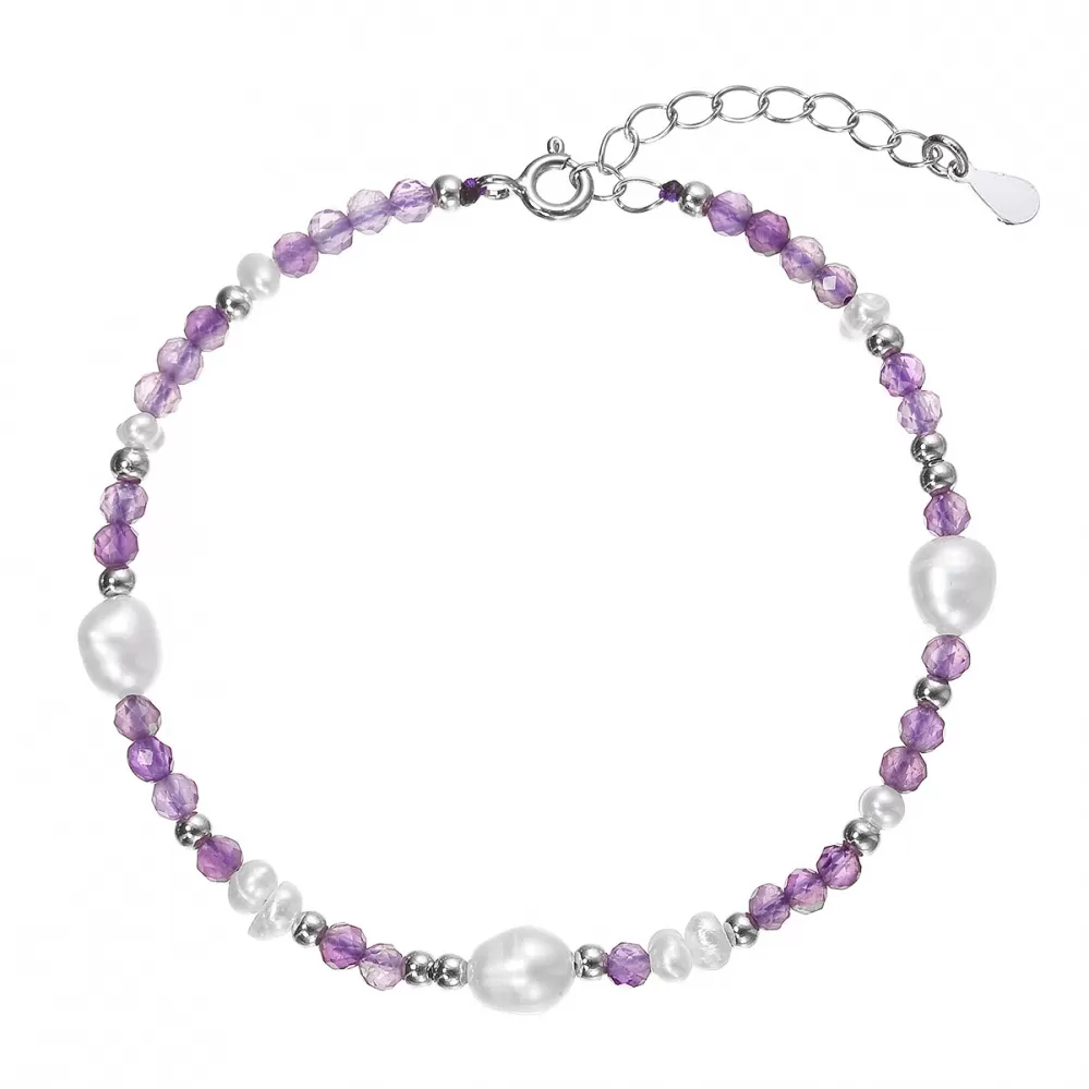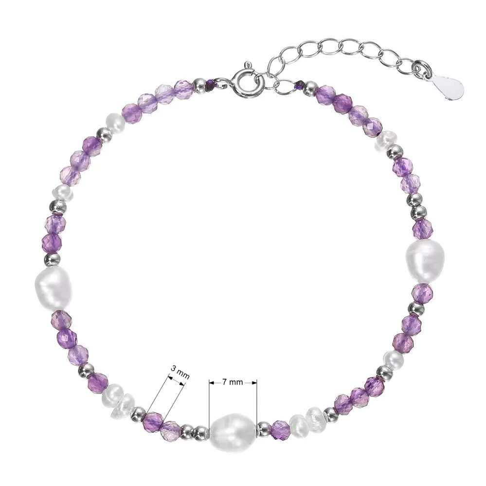 Tento elegantní náramek je tvořen kombinací pravých ametystů v jemně fialové barvě a pravých říčních perel různých tvarů, které dohromady vytvářejí harmonický a ženský celek. Drobné broušené ametysty se krásně lesknou a dokonale ladí s přirozeným perleťovým třpytem perel.