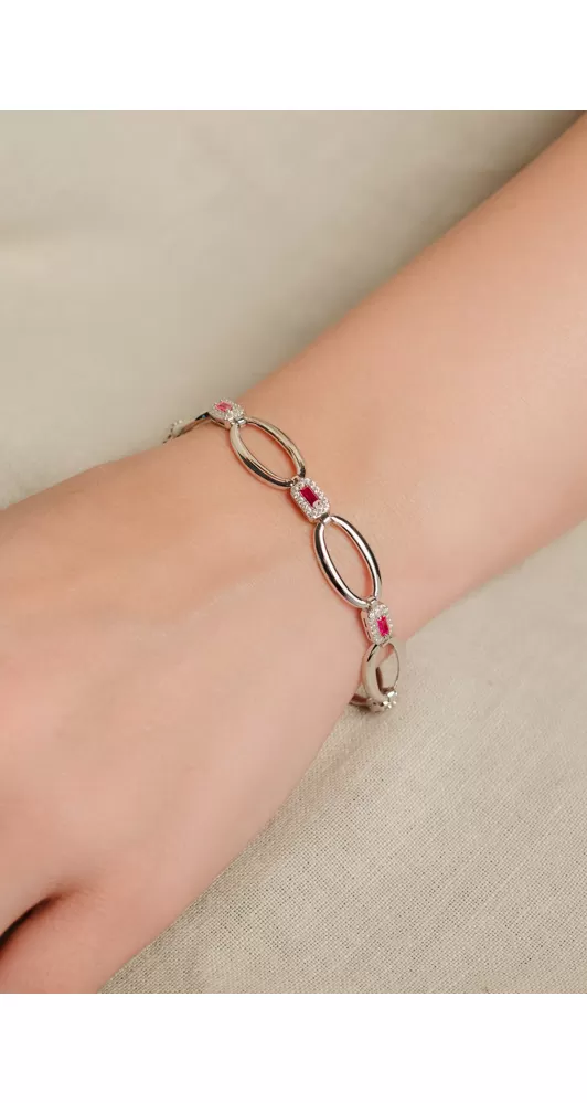 Elegantní stříbrný náramek s rubíny s nádhernou červenou barvou, které dodají vašemu outfitu šarm. Náramek zdobí ozdoby oválného tvaru ve vysokém lesku, které spojují hranaté ozdoby se syntetickým rubínem obdélníkového tvaru a poté ho lemují bílé zirkony briliantového brusu. Tento brus zajišťuje maximální brilanci vybroušených facet, dokonale odráží světlo a neuvěřitelně září z každého úhlu pohledu.