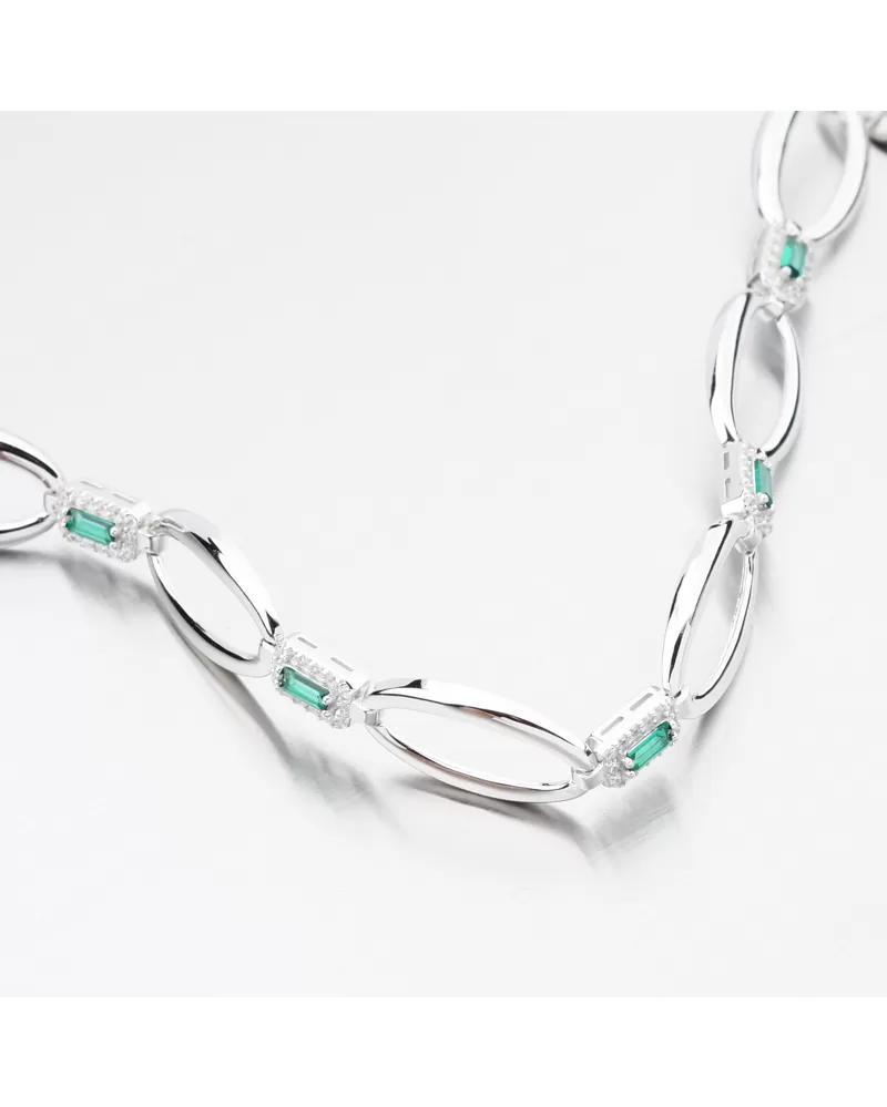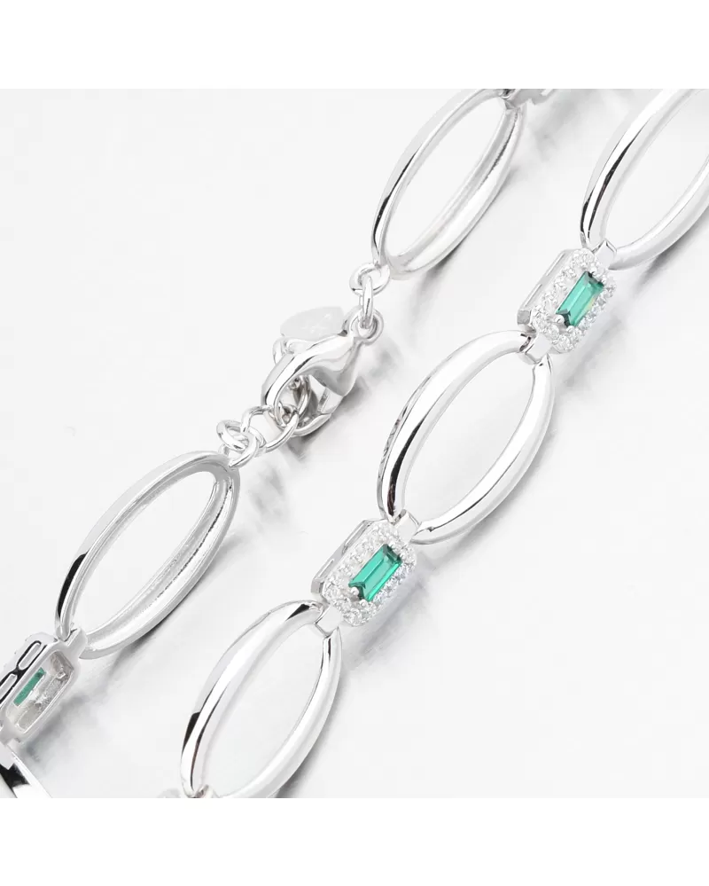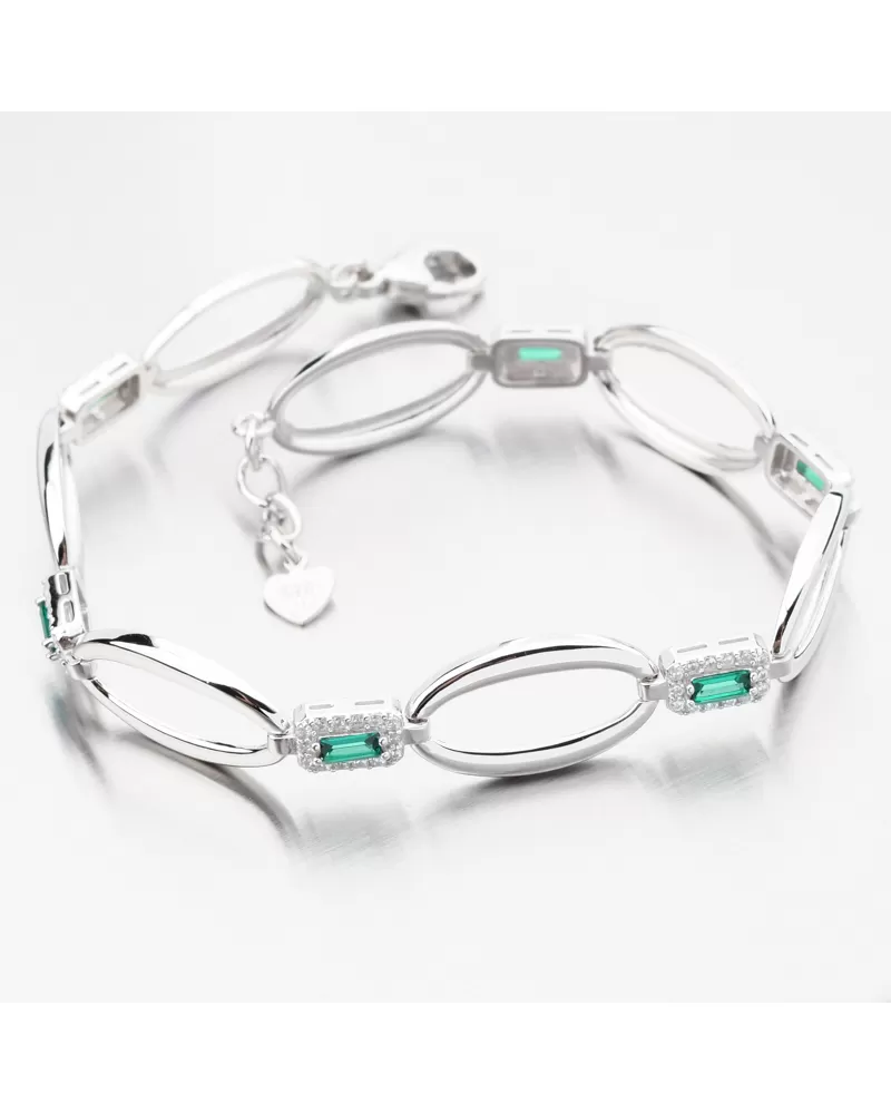 Elegantní stříbrný náramek se smaragdy s nádhernou zelenou barvou, které dodají vašemu outfitu šarm. Náramek zdobí ozdoby oválného tvaru ve vysokém lesku, které spojují hranaté ozdoby se syntetickým smaragdem obdélníkového tvaru a poté ho lemují bílé zirkony briliantového brusu. Tento brus zajišťuje maximální brilanci vybroušených facet, dokonale odráží světlo a neuvěřitelně září z každého úhlu pohledu.