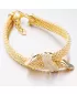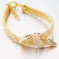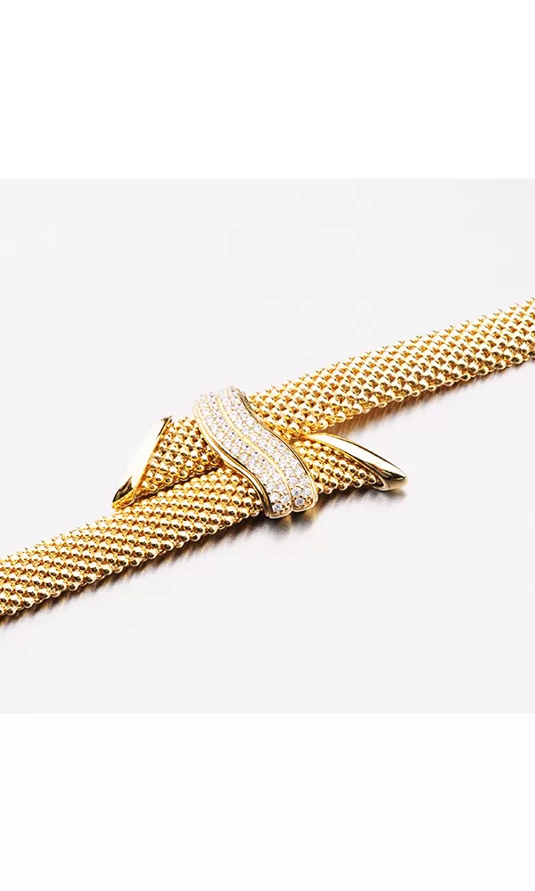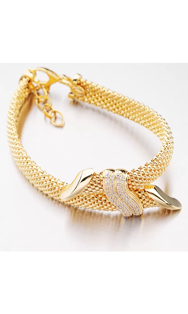 Extravagantní šperk pro odvážné ženy vám dokonale ozdobí zápěstí. Náramek je masivní a zdoben je zirkony v briliantovém brusu. Žlutou barvu zlata mu dodává zlacení PVD Technikou. Předností zlacení technologií PVD je vysoká tvrdost a odolnost proti otěru! Jedná se o silnou vrstvu, která proniká do původního materiálu. Zlacení technologií PVD se dá srovnat s přibližně 12 mikrony galvanického zlacení, což je vysoká hodnota, která při běžném nošení vydrží až několik let. Délka náramku je 18 cm a využití prodlužujícího řetízku o délce 3 cm je možné náramek zapnout na délku 21 cm.
