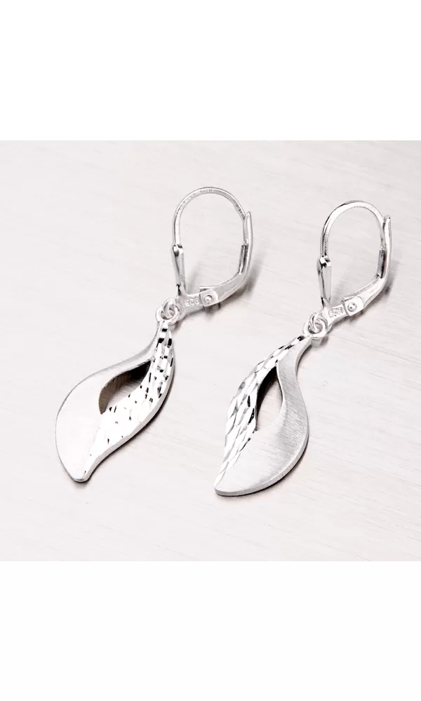 Propracované dámské náušnice jsou ve tvaru lístků s průřezy zdobené sametovým matem a diamantovým gravírováním, kde diamantový hrot rycího nástroje zajišťuje neuvěřitelně vysoký lesk. Náušnice jsou vyrobeny ze stříbra ryzosti 925/1000 a povrch náušnice je zušlechtěn rhodiováním. Tyto náušnice se zapínají na klapku.