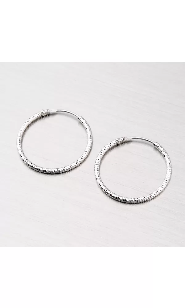 Moderní náušnice – kruhy ze stříbra o ryzosti 925/1000 v lesklé povrchové úpravě. Náušnice jsou rhodiované a jsou zdobeny gravírováním.