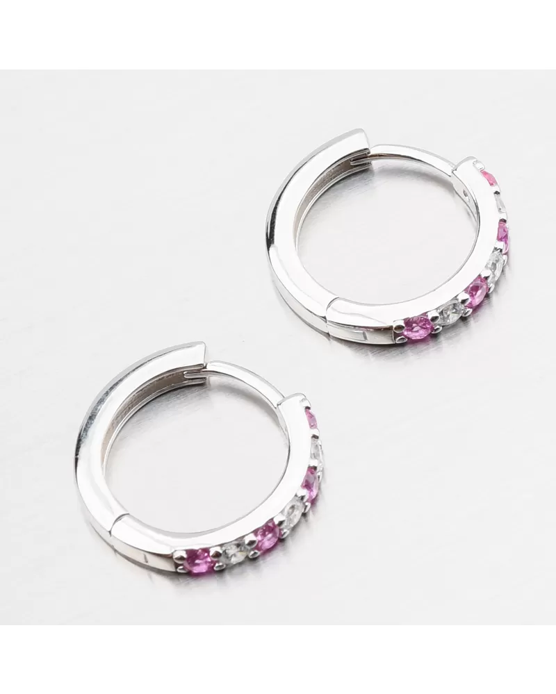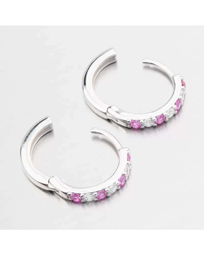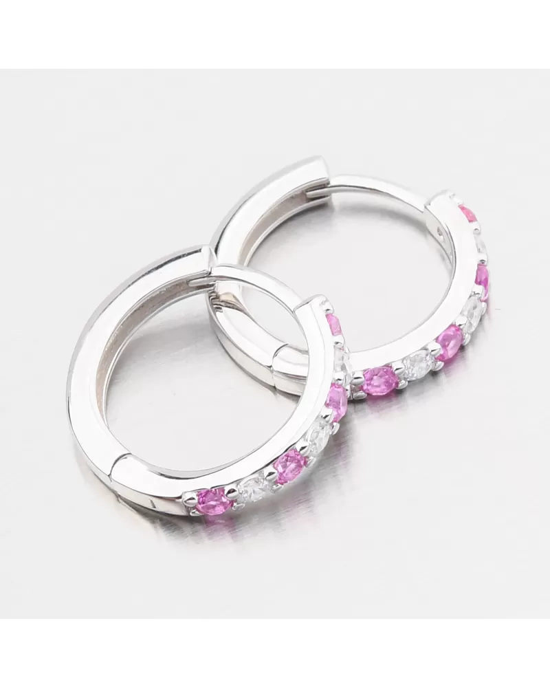 Velmi oblíbený typ náušnic hlavně kvůli své menší velikosti a tím zaručení pohodlnosti po celý den nošení. Kruhy jsou zdobeny v přední části jednou řadou zirkonů, kde se střídá bílá a růžová barva. Zirkony skvěle můžete nakombinovat s dalšími barevnými šperky. Všechny zirkony jsou briliantového brusu, který zajišťuje maximální brilanci vybroušených facet, dokonale odráží světlo a neuvěřitelně září z každého úhlu pohledu.