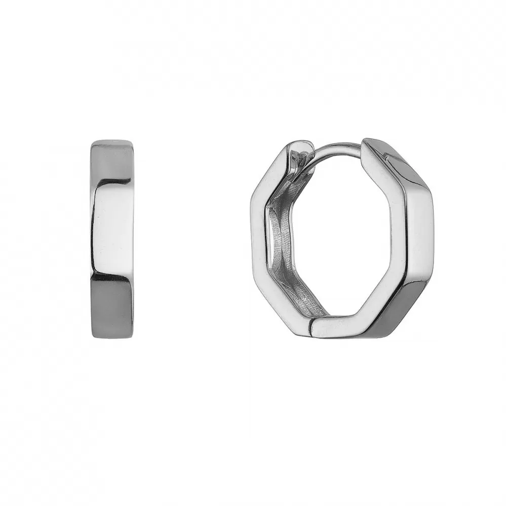 Tyto stříbrné kruhové náušnice vás zaujmou na první pohled svým neobvyklým tvarem. Nejde o klasické kulaté kruhy – jejich design je jemně hranatý, zaoblený do měkkých linií, které dodávají moderní a sofistikovaný vzhled. Hladký povrch bez zdobení nechává vyniknout tvar i lesk kovu.