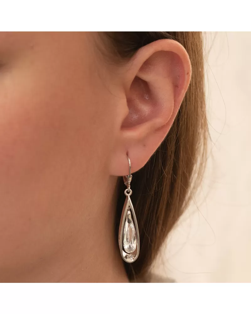 Náušnice jsou ve tvaru kapky, kterou zdobí krystal v bílé barvě a který je precizně vybroušen tak, aby odrážel co nejlépe světlo a dokonale se třpytil. Krystal je usazen tak, aby se volně pohyboval a tím zářil při každém pohybu.