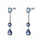 Design náušnic zaujme svým visacím přívěskem o délce přibližně 36,5 mm. Každá náušnice je osázena kombinací čirých a modrých kubických zirkonů, které vytvářejí okouzlující kontrast světla a barev. Modré kameny symbolizují podporu, sebevědomí a klid, díky čemuž náušnice působí elegantně a zároveň výrazně. Zapínání je řešeno klasickou puzetou, která zaručuje bezpečné a pohodlné nošení po celý den.