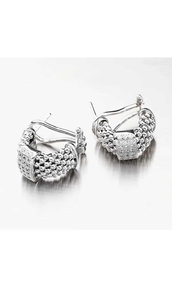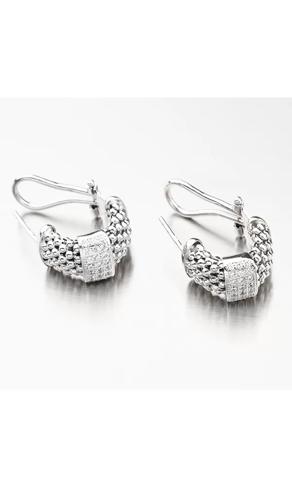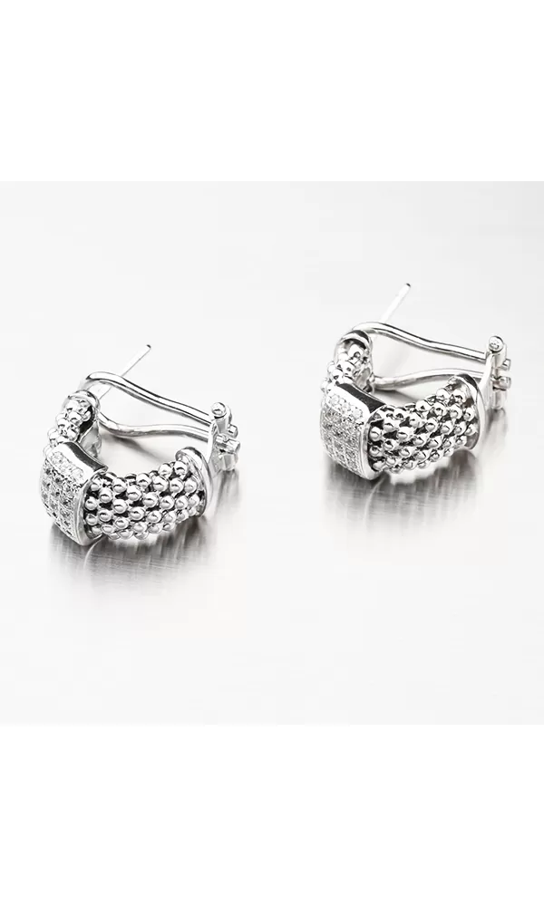 Výrazné náušnice se třemi řadami zirkonů v briliantovém brusu. Tento brus zirkonům propůjčuje brilanci pravých diamantů.  Náušnice mají zapínání podobné klapce, kdy se spodní část zaklapne, ale přímo na ucho a pevně drží. Zapínání je pohodlné a jednoduché na zapnutí.