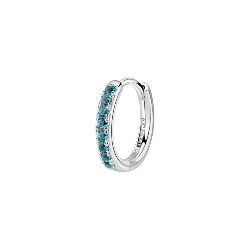 Single náušnice je vyrobena z rhodiovaného stříbra ryzosti 925/1000 v lesklé povrchové úpravě. Rhodium je ušlechtilý drahý kov ze skupiny platinových kovů. Rhodiováním stříbrných prstenů galvanickým nanášením tohoto drahého kovu se stává povrch šperku tvrdší, stálejší a odolnější vůči vnějším vlivům jako je mechanický otěr, poškrábání, nabíhání stříbra, lidský pot, kosmetické přípravky a další. Rhodium je antialergické. Náušnice ve tvaru kruhu je osázena kubickými zirkony.