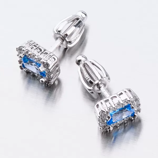 Náušnice jsou v hranatém tvaru zdobené středovým zirkonem v modré barvě, který je broušen do tvaru obdélníku. Kolem tohoto zirkonu jsou vsazeny menší zirkony v briliantovém brusu. Byla by škoda ztratit tento šperk, proto je zvolené zapínání na šroubek, které je bezpečné.