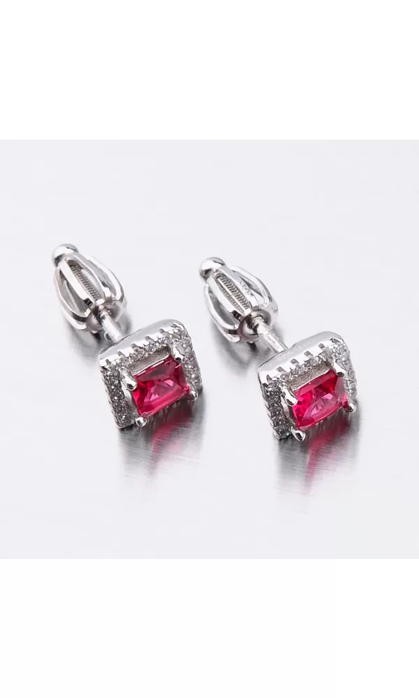 Náušnice jsou v hranatém tvaru zdobené středovým zirkonem v červené barvě, který je broušen do tvaru princes. Kolem tohoto zirkonu jsou vsazeny menší zirkony v briliantovém brusu. Byla by škoda ztratit tento šperk proto je zvolené zapínání na šroubek, které je bezpečné.