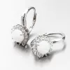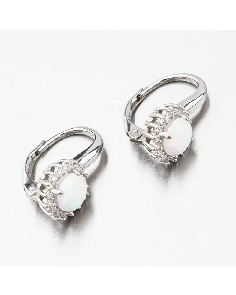 Výrazné stříbrné náušnice osazené syntetickým opálem v bílé barvě, který má nádherné duhové odlesky. Náušnice jsou navíc ozdobeny třpytivými zirkony po celém obvodu. Zirkony jsou broušeny do briliantového brusu, který propůjčuje kamenům brilanci pravých diamantů. Design náušnic je elegantní a zazáříte s nimi při všech příležitostech. Bílá barva opálu je symbolem věčné lásky, proto těmito náušnicemi uděláte radost své milované polovičce. A nebo je druhá varianta, že tento opál může být použit pro přivedení nové lásky.
