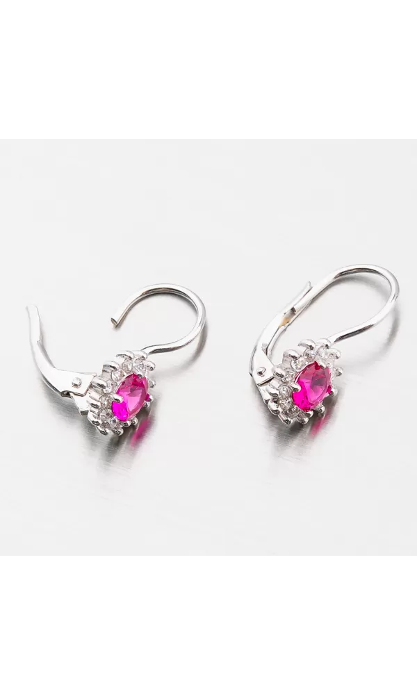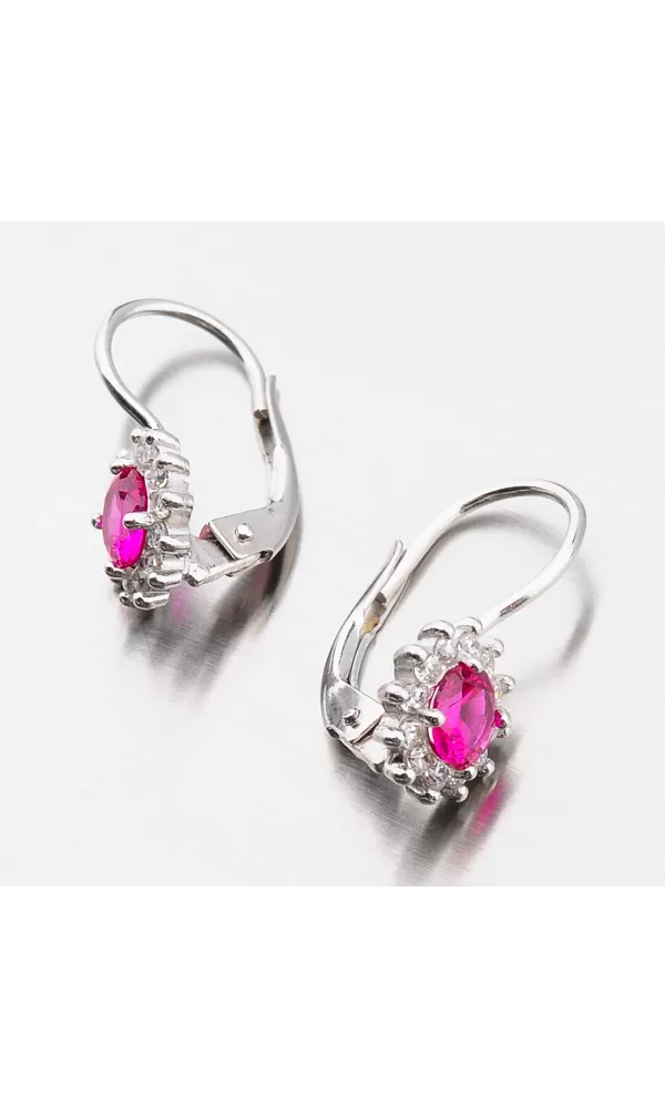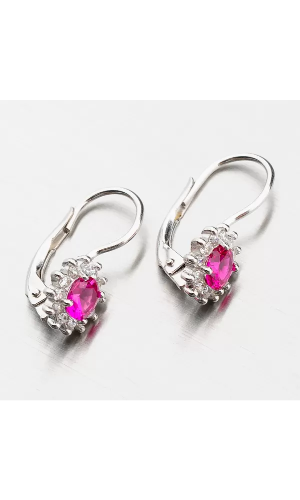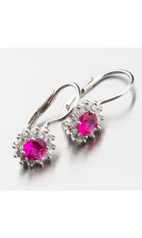 Jemné stříbrné dámské náušnice se syntetickým rubínem a zářivými zirkony vás zaujmou na první pohled. Náušnice jsou vyrobeny ze stříbra o ryzosti 925/1000 s rhodiováním v lesklé povrchové úpravě a se zapínáním na bezpečnou klapku, díky které nehrozí vypadnutí náušnic z ucha a jejich následná ztráta.