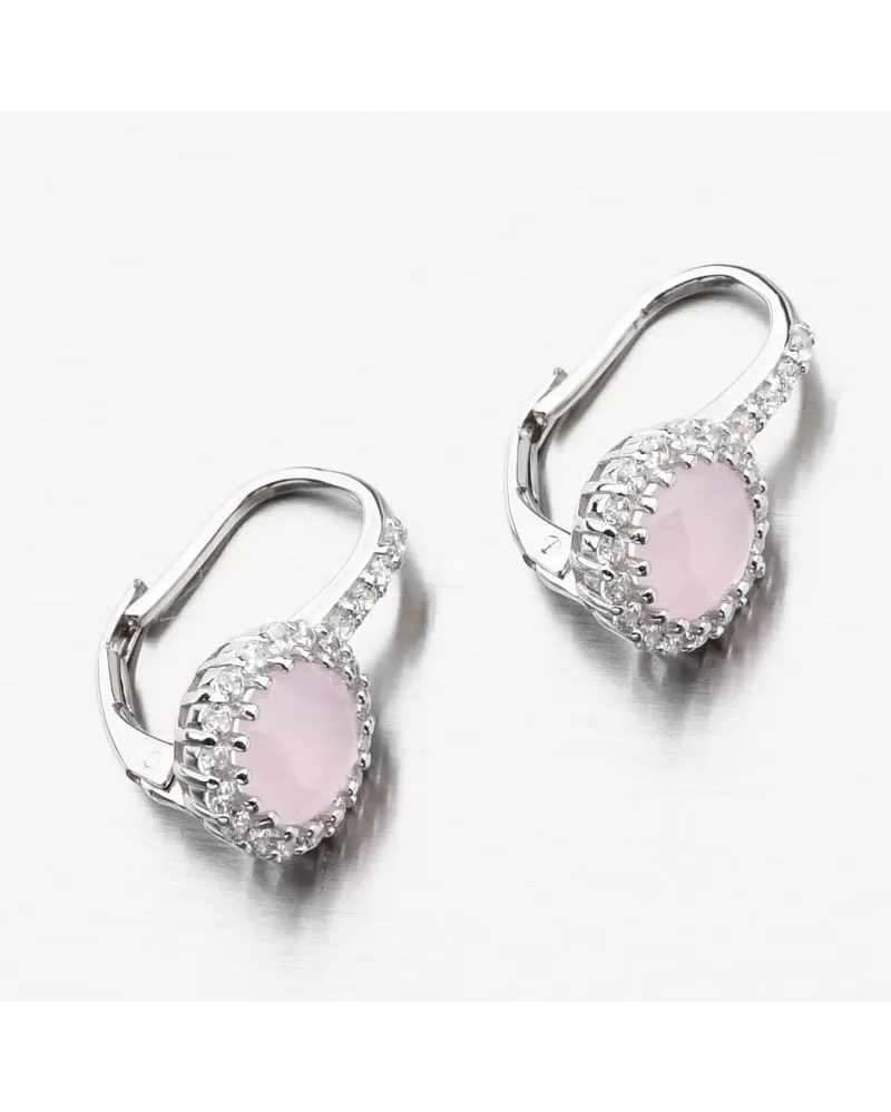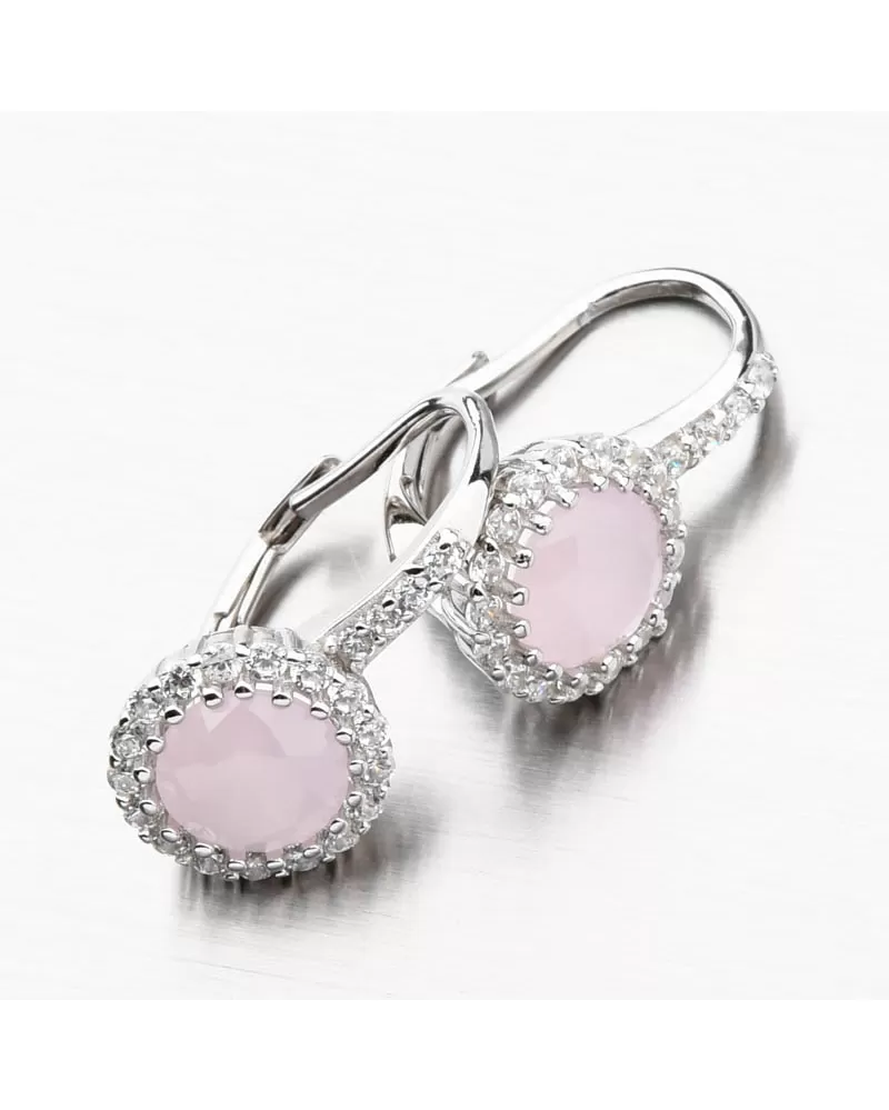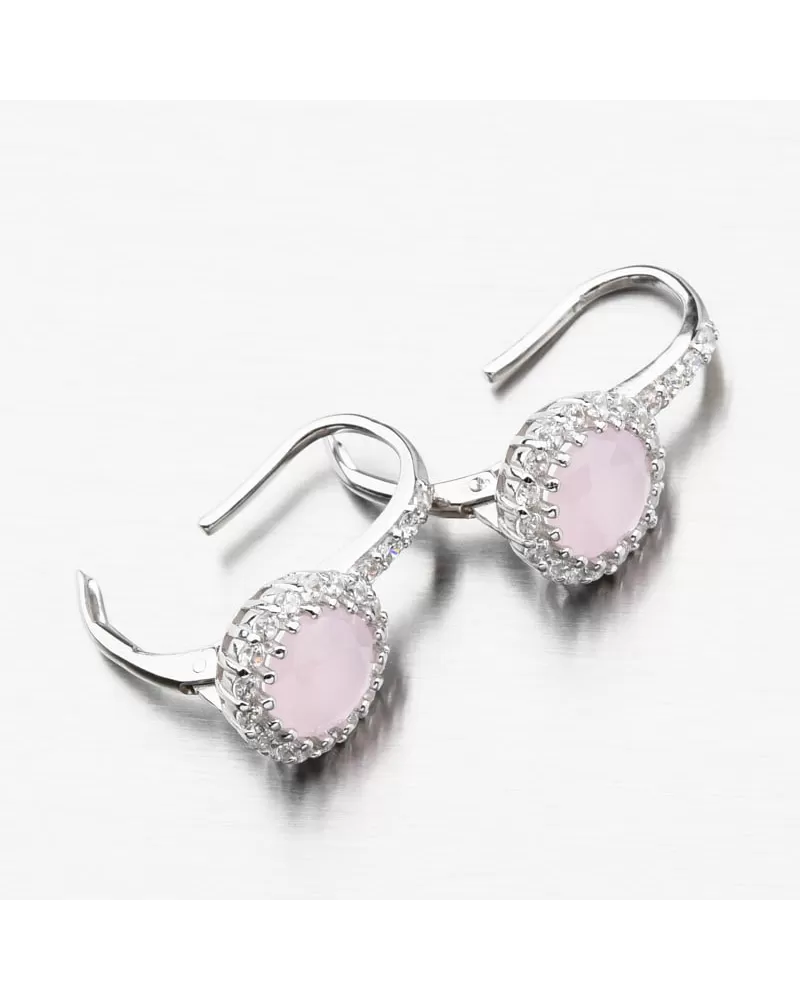 Elegantní stříbrné náušnice se syntetickým růženínem, který je na pevno usazen do krapen a kolem něj jsou vysazeny bílé zirkony po celém obvodu. Ty jsou také vsazeny do přední části zapínání. Zirkony jsou briliantového brusu, který vytváří oslnivou brilanci.