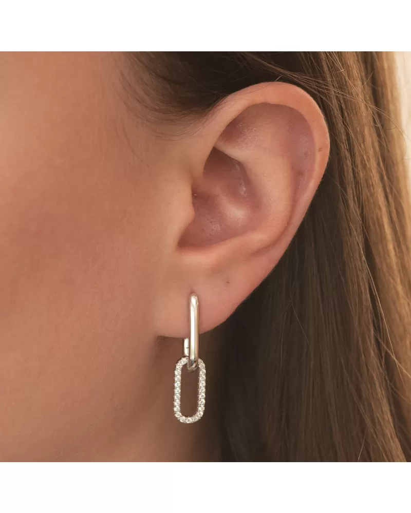 Stříbrné náušnice ve tvaru písmene U zdobené zářivými zirkony, které visí na oválné ozdobě ve spodní části náušnice. Zirkony jsou briliantového brusu, který zajišťuje maximální brilanci vybroušených facet, dokonale odráží světlo a neuvěřitelně září z každého úhlu pohledu. Náušnice mají krásný zářivý vzhled, dodávají eleganci v každém směru.