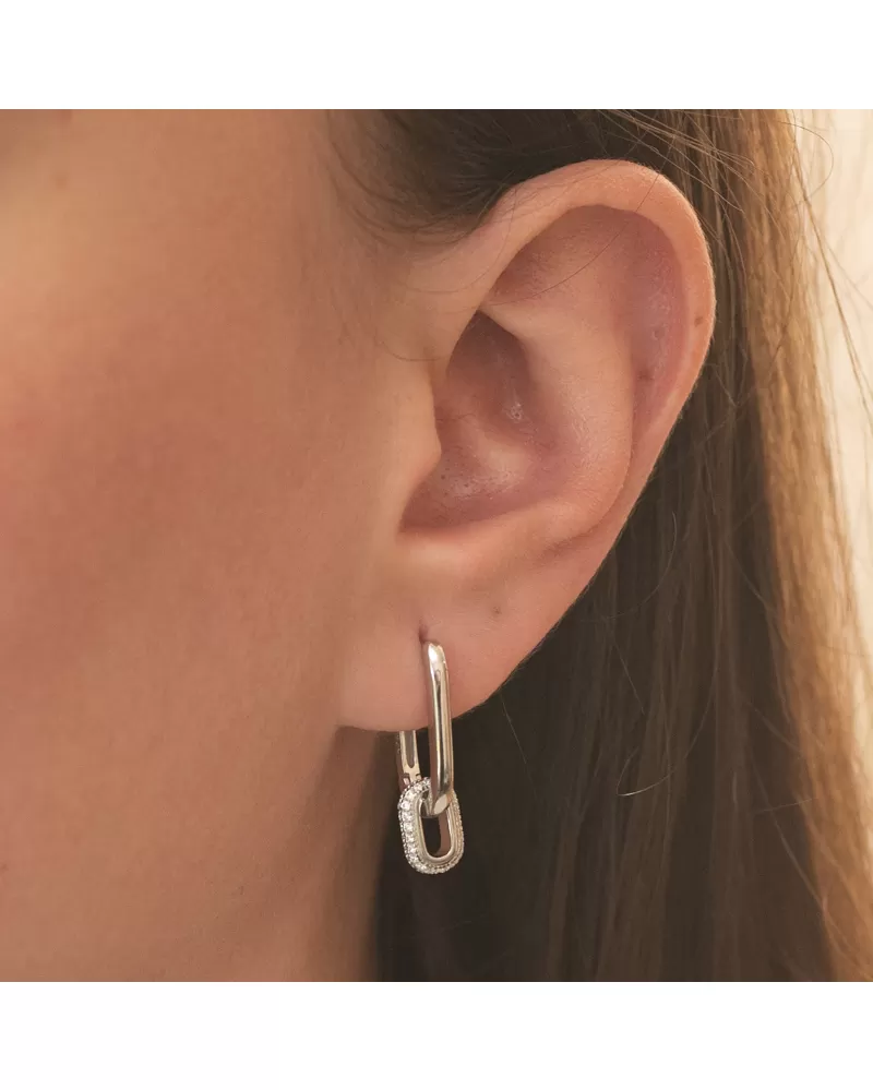 Stříbrné náušnice ve tvaru písmene U zdobené zářivými zirkony, které visí na oválné ozdobě ve spodní části náušnice. Zirkony jsou briliantového brusu, který zajišťuje maximální brilanci vybroušených facet, dokonale odráží světlo a neuvěřitelně září z každého úhlu pohledu. Náušnice mají krásný zářivý vzhled, dodávají eleganci v každém směru.