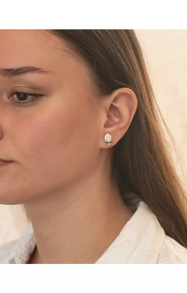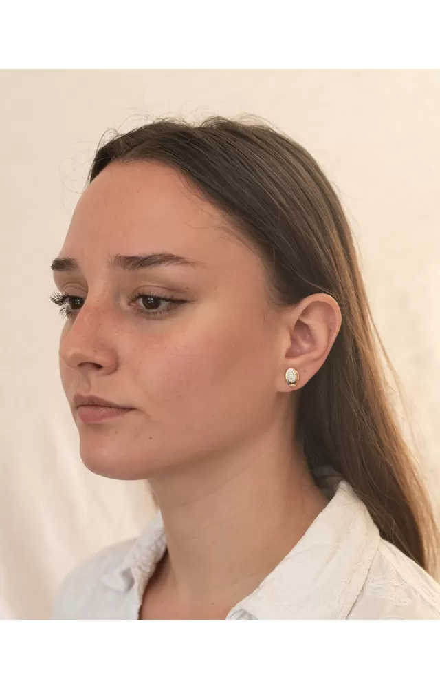 Decentní a elegantní stříbrné náušnice, které však zaujmou svým zdobením zářivými zirkony. Ozdoba náušnic je oválného tvaru, kde převážnou část zdobí drobné zirkony. Všechny zirkony jsou briliantového brusu, který zajišťuje maximální brilanci vybroušených facet, dokonale odráží světlo a neuvěřitelně září z každého úhlu pohledu.