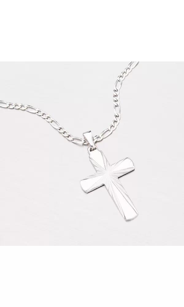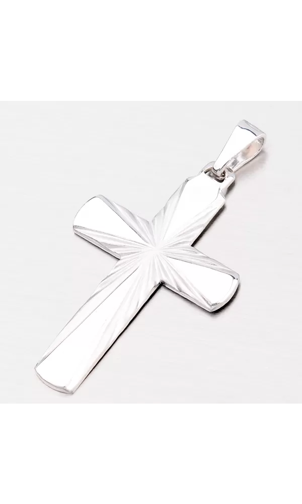 Tento přívěsek ve tvaru kříže je vyrobený ze stříbra o ryzosti 925/1000 v lesklé povrchové úpravě kromě matných paprsků, které vedou od prostředka kříže směrem ven. Povrch přívěsku je zušlechtěn rhodiováním. Rhodium je ušlechtilý drahý kov ze skupiny platinových kovů. Rhodiováním stříbrných šperků galvanickým nanášením tohoto drahého platinového kovu se stává povrch šperku tvrdší, stálejší a odolnější vůči vnějším vlivům jako je mechanický otěr, poškrábání, nabíhání stříbra, lidský pot, kosmetické přípravky a další. Rhodium je antialergické.