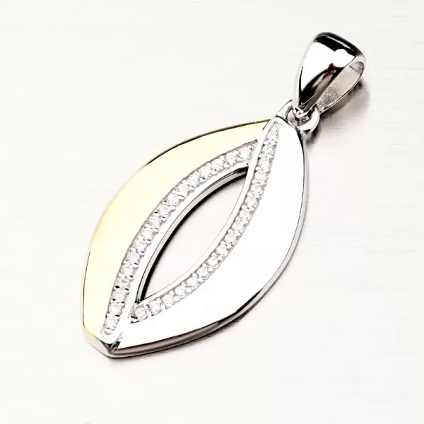 Elegantní přívěsek zdobený zirkony a zlacením. Vnitřní část je lemována z obou stran zářivými zirkony v briliantovém brusu, z toho jedna polovina přívěsku je stříbrná a druhá polovina je v barvě žlutého zlata. Tato část je zlacená technikou PVD. Předností zlacení technologií PVD je vysoká tvrdost a odolnost proti otěru! Jedná se o silnou vrstvu, která proniká do původního materiálu. Zlacení technologií PVD se dá srovnat s přibližně 6 mikrony galvanického zlacení, což je vysoká hodnota, která při běžném nošení vydrží až několik let. Přívěsek je velmi lehký a bude tak pohodlný pro celodenní nošení při všech příležitostech.