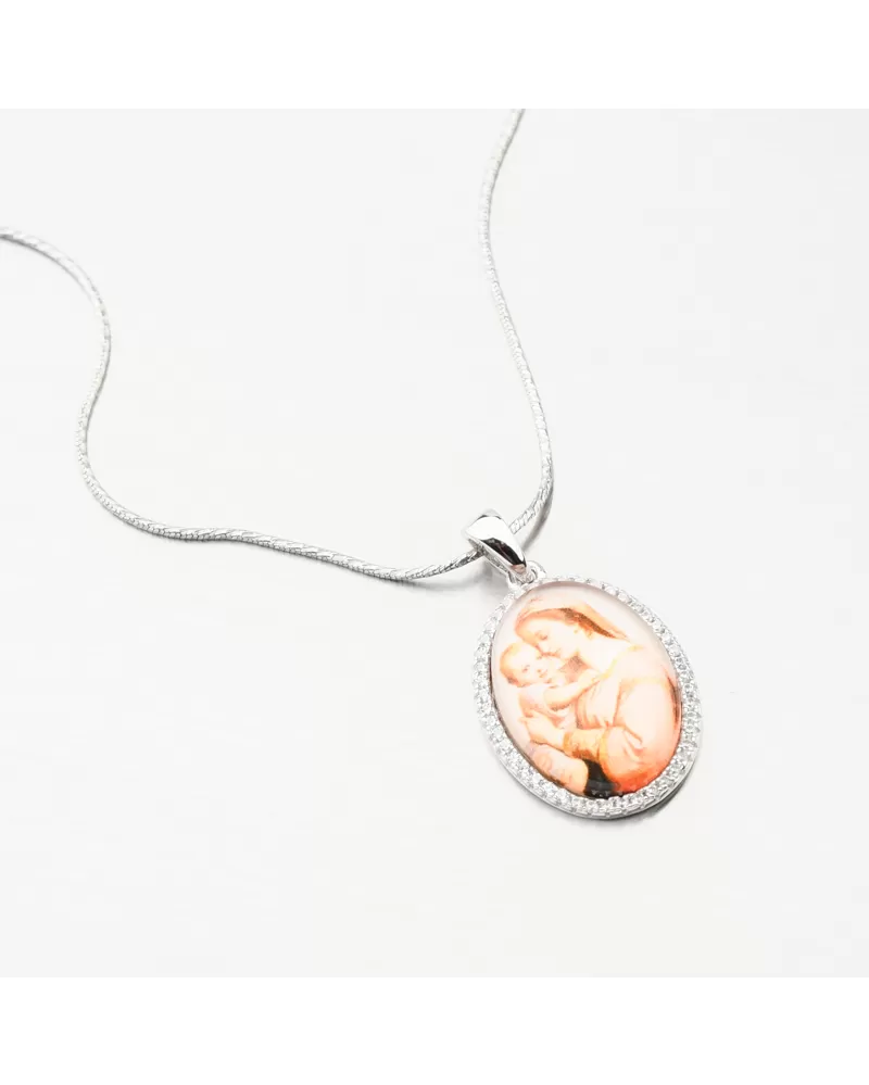 Stříbrný přívěsek madonka můžete pořídit jako ochranný amulet. Přívěsek madonka patří v křesťanské tradici k nejoblíbenějším šperkům. Přívěsek oválného tvaru tvoří vyobrazená Madona s dítětem. Po celém obvodu přívěsku jsou vsazeny zářivé zirkony briliantového brusu. Tento brus zajišťuje maximální brilanci vybroušených facet, dokonale odráží světlo a neuvěřitelně září z každého úhlu pohledu.
