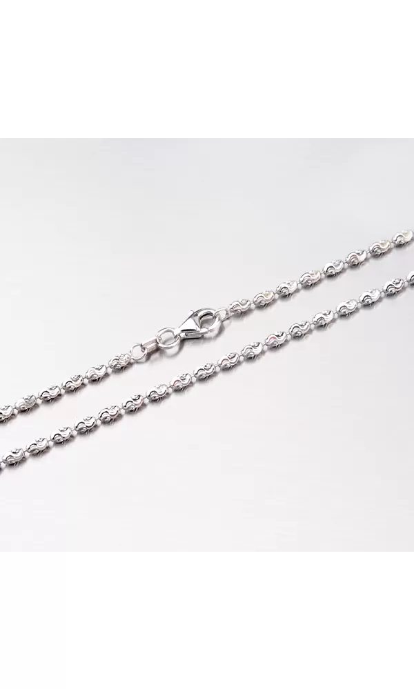Nádherný řetízek vyrobený ze stříbra o ryzosti 925/1000 je složený z oválných korálků, které jsou zdobené gravírovanými facetami. Facety jsou dělané za pomocí diamantového nástroje a dodávají šperku maximální lesk a brilanci ze všech úhlů pohledu. Pro vysokou odolnost řetízku je jeho povrch zušlechtěn rhodiováním. Rhodium je ušlechtilý drahý kov ze skupiny platinových kovů. Rhodiováním stříbrných šperků galvanickým nanášením tohoto drahého kovu se stává povrch šperku tvrdší, stálejší a odolnější vůči vnějším vlivům jako je mechanický otěr, poškrábání, nabíhání stříbra, lidský pot, kosmetické přípravky a další. Rhodium je antialergické.