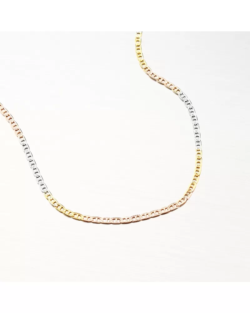 Designový tříbarevný řetízek je vyrobený ze stříbrna ryzosti 925/1000 v lesklé povrchové úpravě se zapínáním na pérový kroužek. Řetízek je pozlacený žlutou, růžovou a bílou barvou zlata. Povrch řetízku je zdobený gravírováním - facety jsou zhotoveny diamantovým nástrojem, který dodává vzniklým facetám maximální lesk, díky kterému dokonale odráží světlo a mají krásnou brilanci ze všech úhlů pohledu! Řetízek krásně vynikne při jakékoli příležitosti!