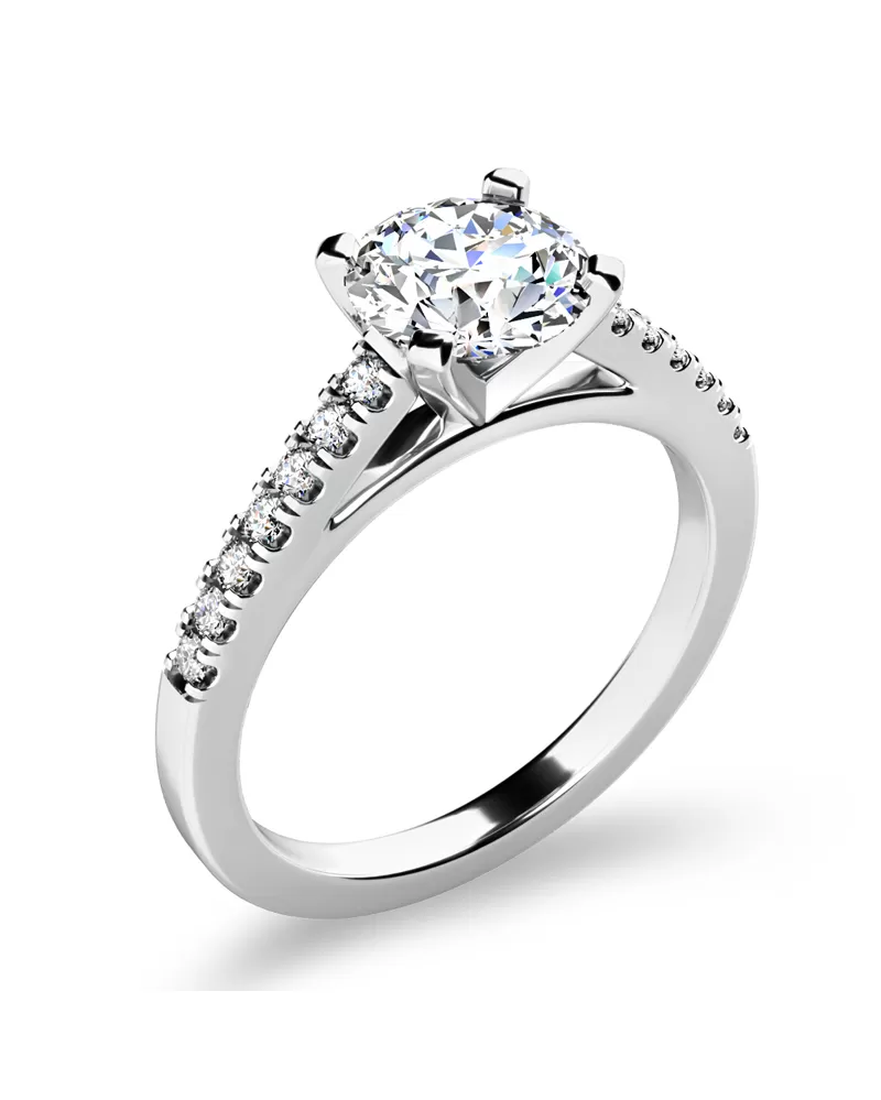 Zásnubní prsten je vyroben z bílého čtrnáctikarátového zlata - 585/1000 v lesklé povrchové úpravě. Prsten má jeden hlavní dominantní zirkon kulatého brusu, který je uchycený do čtyřkrapnové korunky. Toto uchycení nechá zirkon dokonale vyniknout v jeho kráse a brusu. Po stranách v obroučce prstenu je vsazeno na každé straně 7 zářivých zirkonů, které prsten zjemňují. Všechny zirkony mají briliantový brus Signity star, který zajišťuje maximální brilanci kamenů. Díky skladbě a stylově čistému vsazení zirkonů, vyniká prsten krásnou brilancí kamenů. Vsazování zirkonů do zásnubních prstenů provádějí naši nejzkušenější mistři zlatníci ručně pod mikroskopem s přesností na 0,01mm a proto nehrozí vypadnutí kamínků jako to bývá u strojně vyráběných zásnubních prstenů.