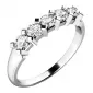 Moderní zásnubní prsten je vyroben z bílého čtrnáctikarátového zlata - 585/1000 v lesklé povrchové úpravě. V prstenu je vsazeno pět kulatých zirkonů. Všechny zirkony mají briliantový brus Signity star, který zajišťuje maximální brilanci kamenů. Vsazování zirkonů do zásnubních prstenů provádějí naši nejzkušenější mistři zlatníci ručně pod mikroskopem s přesností na 0,01mm a proto nehrozí vypadnutí kamínků jako to bývá u strojně vyráběných zásnubních prstenů.