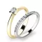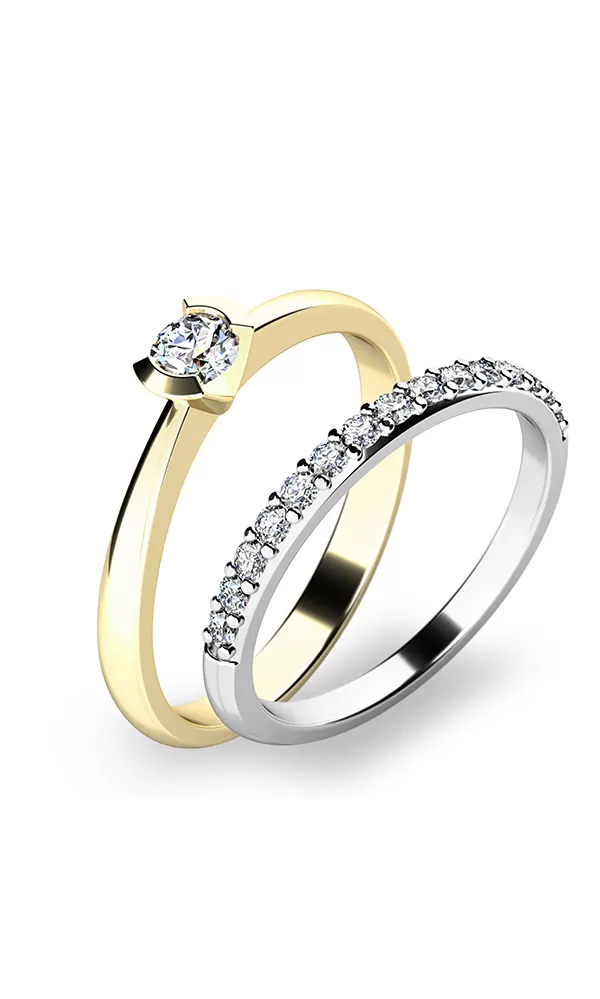 Hledáte zajímavý zásnubní prsten? Chcete zaujmout netradičním kouskem? Přesně pro vás tu máme tento krásný set prstenů 10840 a 10845, který si vaše milovaná zamiluje. Prsteny jsou vyrobené ze čtrnácti karátového žlutého a bílého zlata o ryzosti 585/1000 s lesklým povrchem. Hlavní prsten je vyrobený podle moderních trendů a obsahuje jeden středový kulatý zirkon v briliantovém brusu. Kroužek je osázen patnácti kusy menších zirkonů v jedné linii.