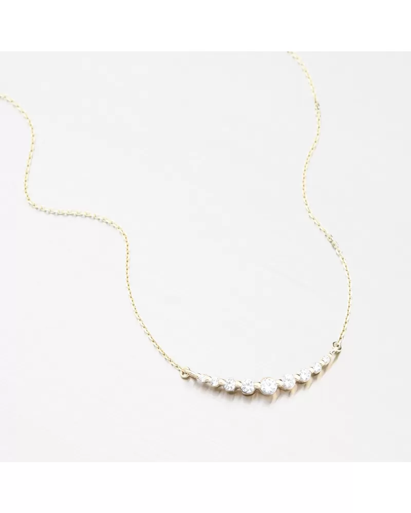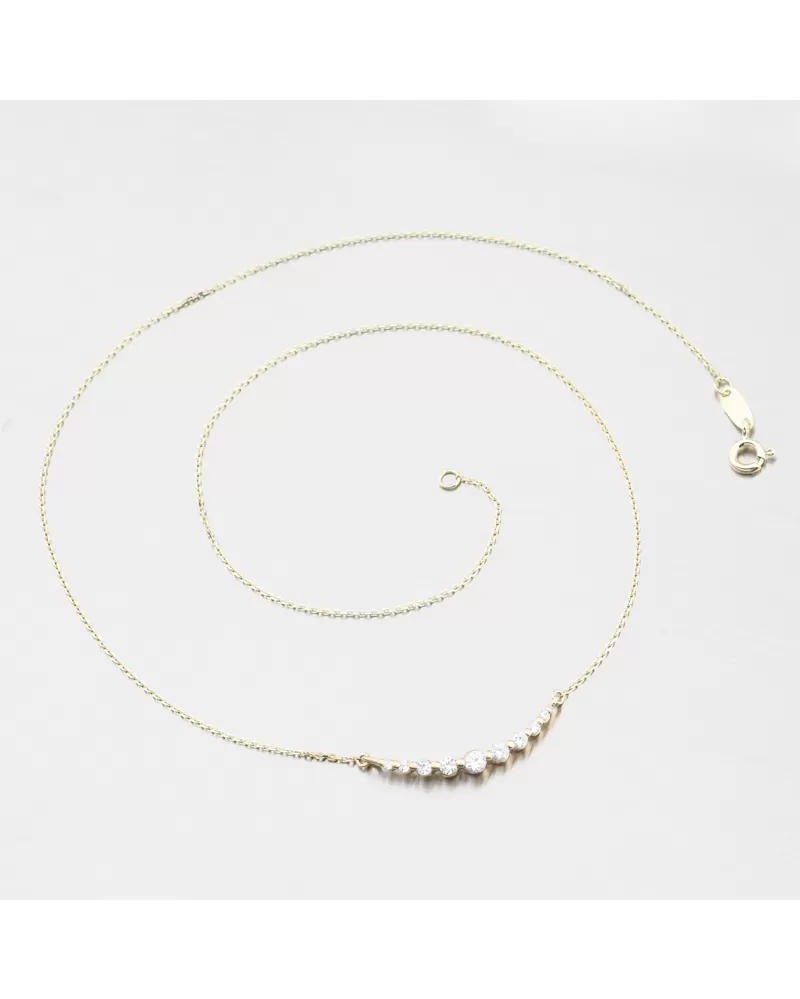 Zlatý náhrdelník se zirkony – jemná linie elegance a světla. Každý pohyb zachytí záblesk světla. Tento zlatý náhrdelník zdobí řada precizně broušených zirkonů, které přecházejí od menších po větší – vytvářejí tak plynulou, elegantní linii lesku. Zirkony jsou briliantového brusu, který zajišťuje maximální brilanci vybroušených facet, dokonale odráží světlo a neuvěřitelně září z každého úhlu pohledu. Design působí jemně, moderně a nesmírně ženským dojmem.