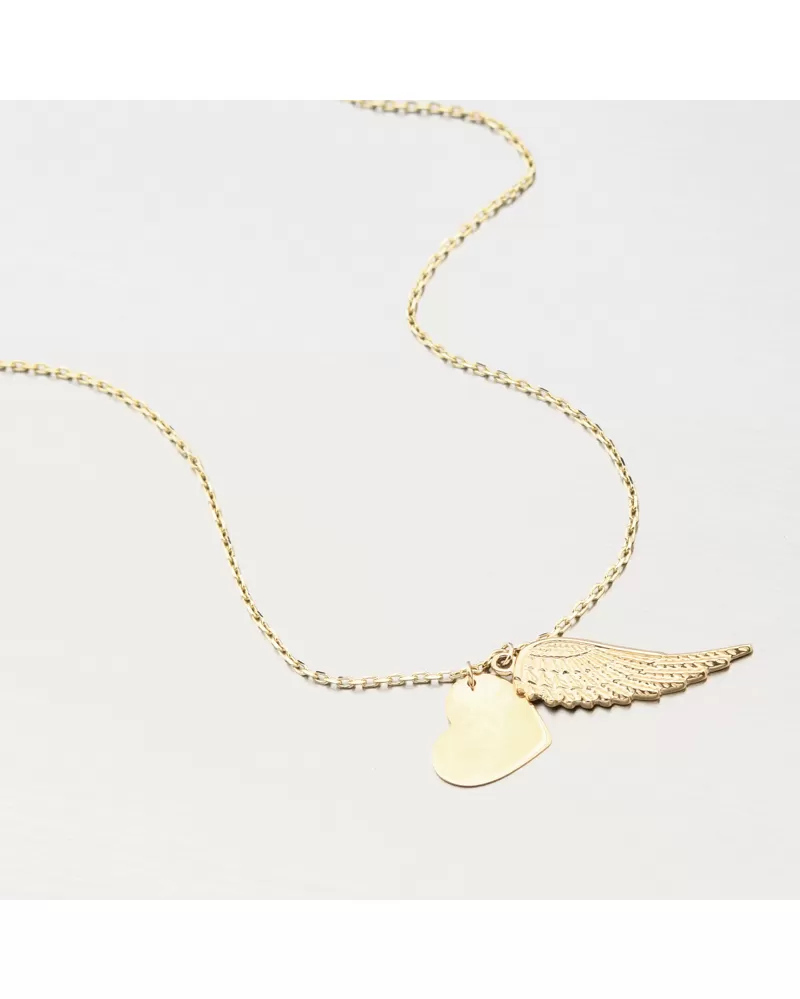Stále přemýšlíte, jaký dárek koupit své milované polovičce? Tento zlatý náhrdelník bude velkým favoritem. Jemný řetízek typu anker zdobí lesklé srdíčko a andělské křídlo. Na srdíčko lze vyrýt vámi vybraný text jako je např. datum, jméno nebo cokoliv, co je pro vás důležité. Vámi vybraný text prosím uveďte do kolonky "rytina".