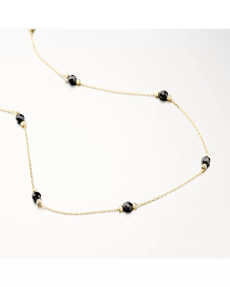 Máte rády černou barvu? Ozdobte se tímto originálním náhrdelníkem. Náhrdelník je tvořený řetízkem typu anker, který je zdobený zlatými kuličkami a mezi nimi je vždy černý broušený zirkon. Zlaté kuličky jsou zvýrazněné facetami. Facety jsou zhotoveny diamantovým nástrojem, který dodává vzniklým facetám maximální lesk, díky kterému dokonale odráží světlo a mají krásnou brilanci ze všech úhlů pohledu!