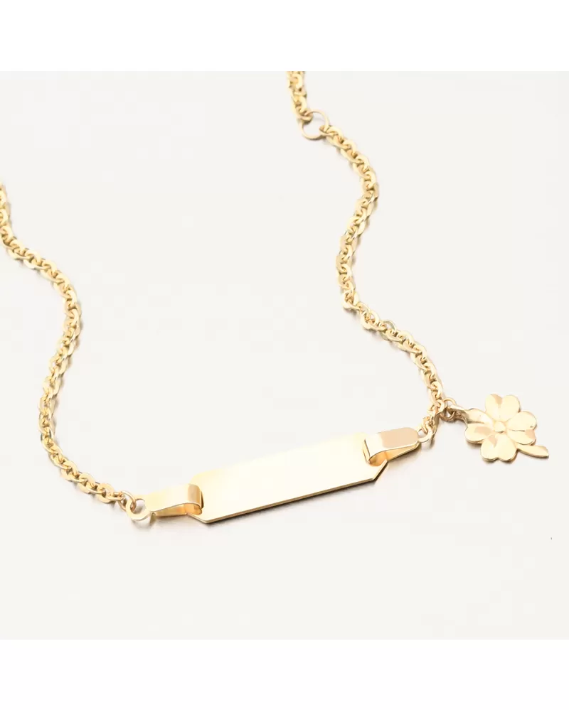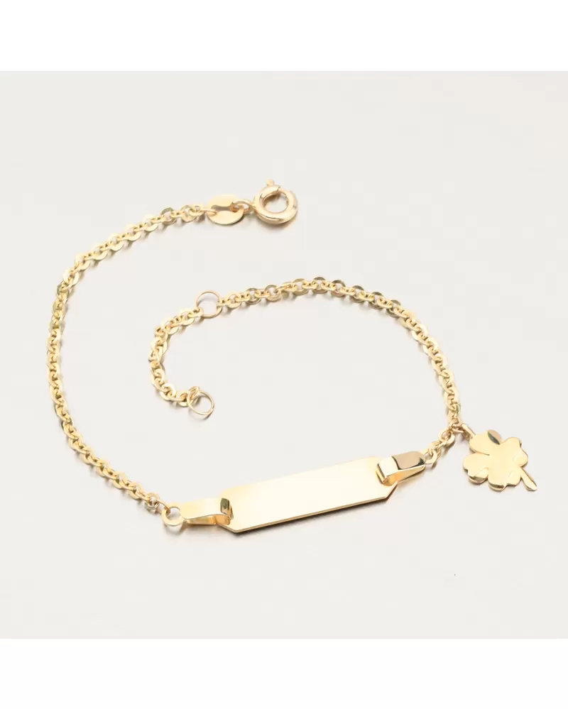 Jemný dětský zlatý náramek tvořený zářivým řetízkem, který září ze všech stran. V samotném středu náramku se nachází lesklá destička. Na tuto destičku si můžete nechat vyrýt vámi vybraný text jako je například datum, jméno či jiný text. Detaily rytiny prosím uveďte do kolonky rytina nebo speciální požadavky. U destičky se také nachází drobný visací čtyřlístek pro štěstí.