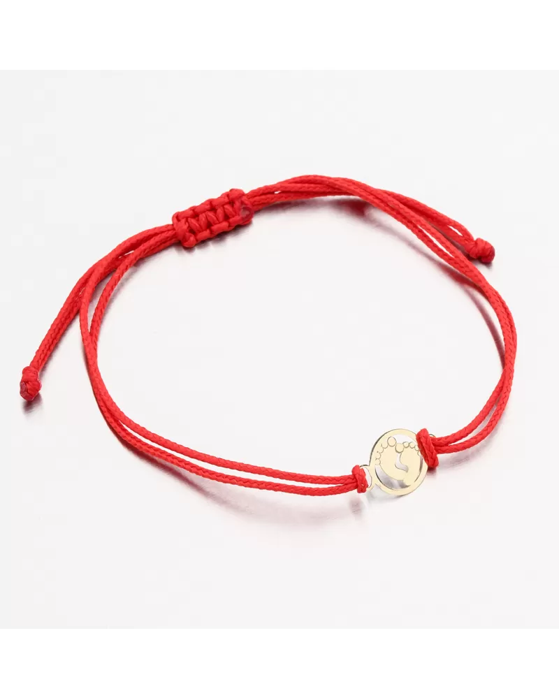 Velmi oblíbený typ provázkového náramku, který má výhodu ve své univerzální velikosti a oblíbené červeno-žluté kombinaci barev. Náramek je tvořen z červeného dvojitého provázku s kulatým přívěskem ze žlutého zlata. Přívěsek zdobí motiv dětských chodidel, což je symbol lásky, ochrany a nezapomenutelných okamžiků.