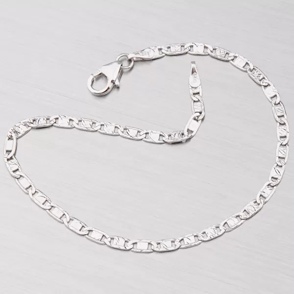 Krásný, dámský náramek z bílého čtrnáctikarátového zlata 585/1000 v lesklé povrchové úpravě. Náramek má gravírované plošky za pomocí nástroje s diamantovým hrotem, který dodává šperku maximální lesk. Náramek má zapínání na karabinku.
