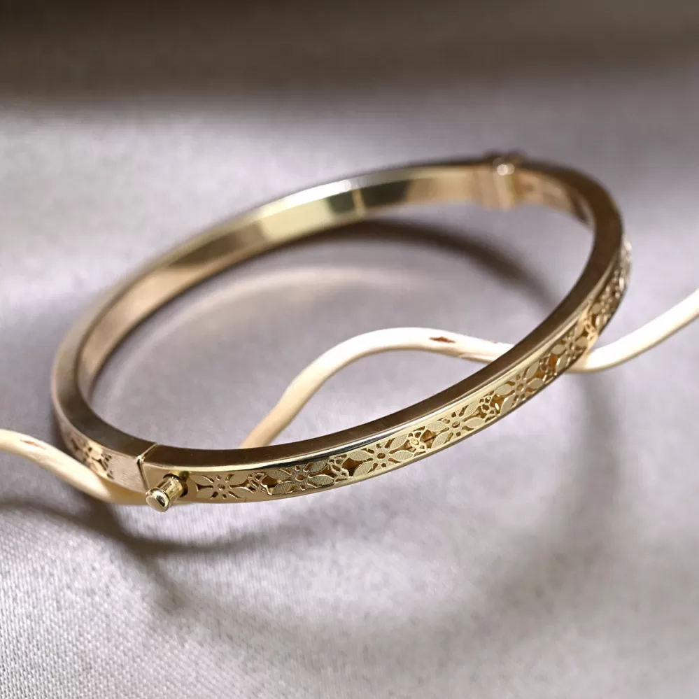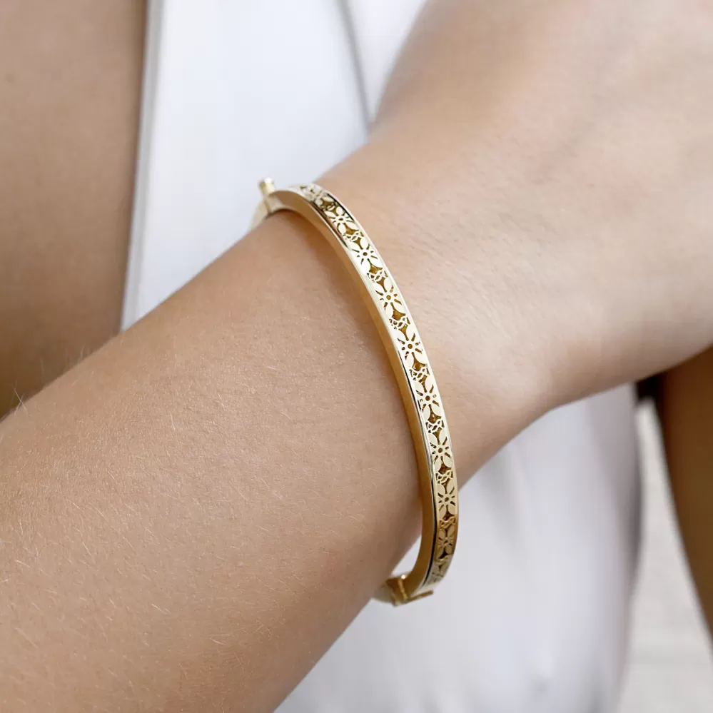 Elegantní náramek z pravého 14karátového zlata zaujme svým jemným gravírováním po celém obvodu, které mu dodává luxusní a zároveň nadčasový vzhled.