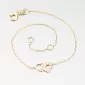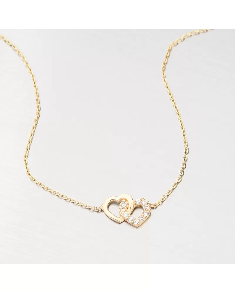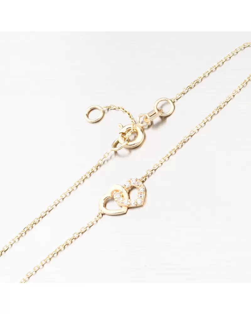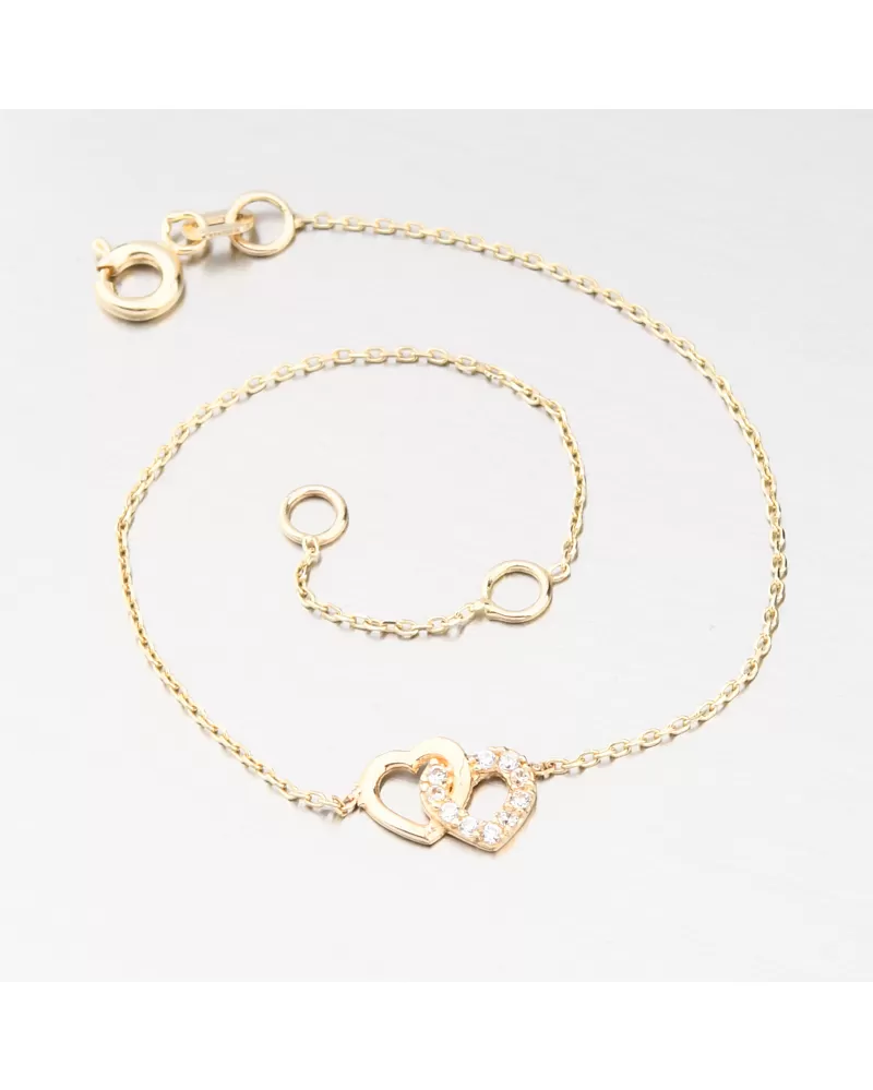 Jemný zlatý náramek, který má v samotném středu dvě propletená srdíčka. Jedno srdce je osazené zářivými zirkony a druhé je ve vysokém lesku. Zirkony jsou s briliantovým brusem Signity star, který dodává zirkonům maximální brilanci.