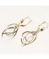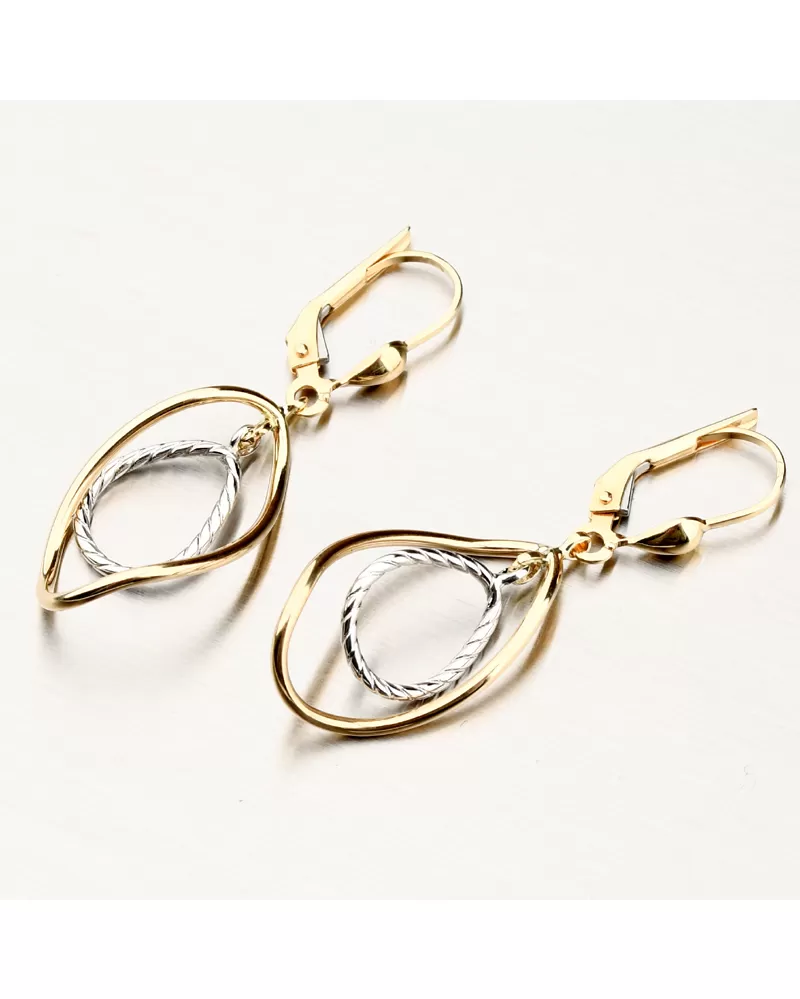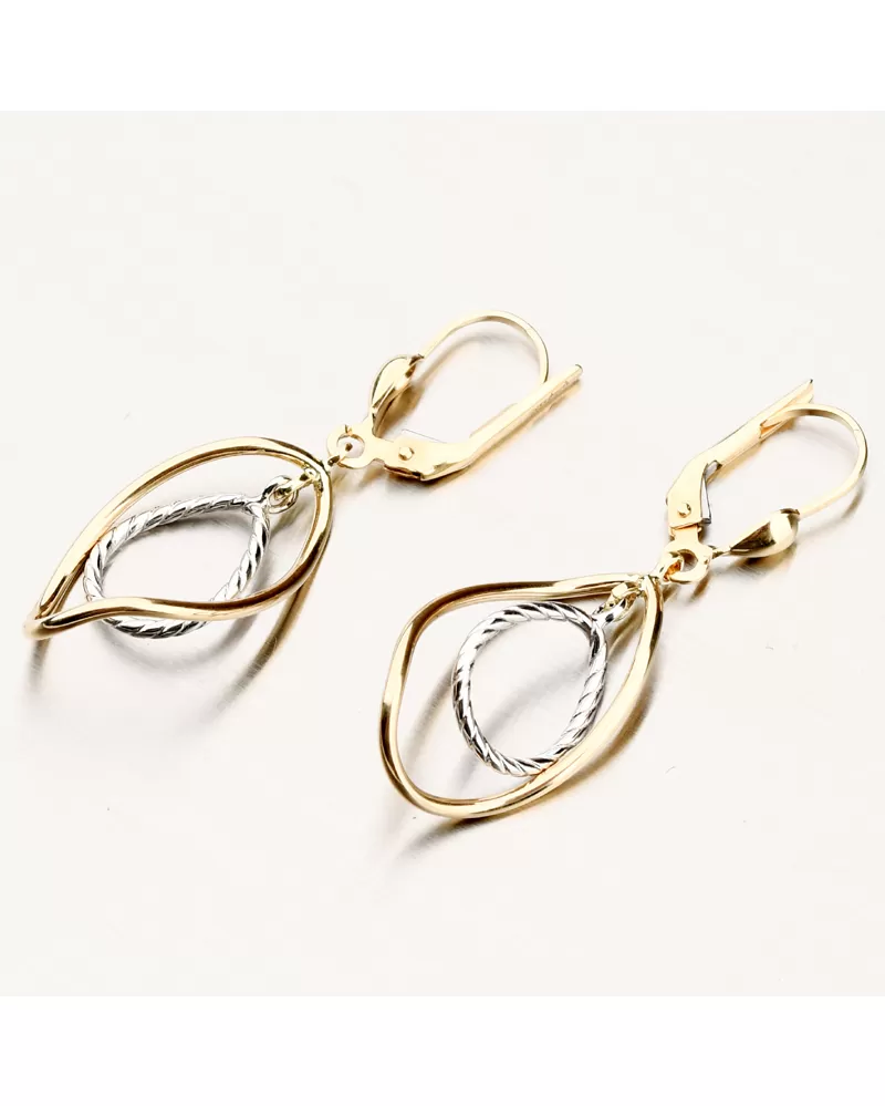 Elegantní visací zlaté náušnice, které mají zajímavě tvarovanou ozdobu. Ozdoba je prohlého tvaru v lesku ve žluté barvě zlata a poté ve středu ozdoby je ještě menší ozdoba ve tvaru kapky, která je v bílé barvě zlata a má vroubkovaný povrch. Tyto elegantní visací náušnice působí jemně, žensky a okouzlí na první pohled svým vytříbeným designem. Jejich ladný pohyb a decentní třpyt dodají každému outfitu nádech lehkosti a sofistikovanosti. Perfektní volba pro ženy, které hledají šperk, jenž podtrhne jejich styl s výrazným šarmem.