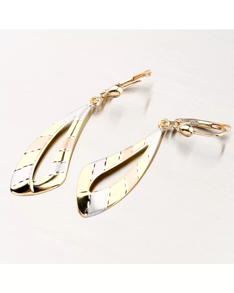 Tyto luxusní visací náušnice okouzlí svým výrazným provedením. Náušnice zdobí ozdoba, která je ve žluté, bílé a růžové barvy zlata. Z toho bílá a růžová barva je v matném provedení. Elegantní podlouhlý tvar prodlužuje siluetu a dodává celému vzhledu noblesu. Perfektní volba pro ženu, která touží po jedinečném šperku spojujícím originalitu a výjimečný styl. Náušnice zdobí facety, jedná se o lesklé plošky dělané za pomocí diamantového hrotu a dodávají šperku maximální lesk a brilanci ze všech úhlů.